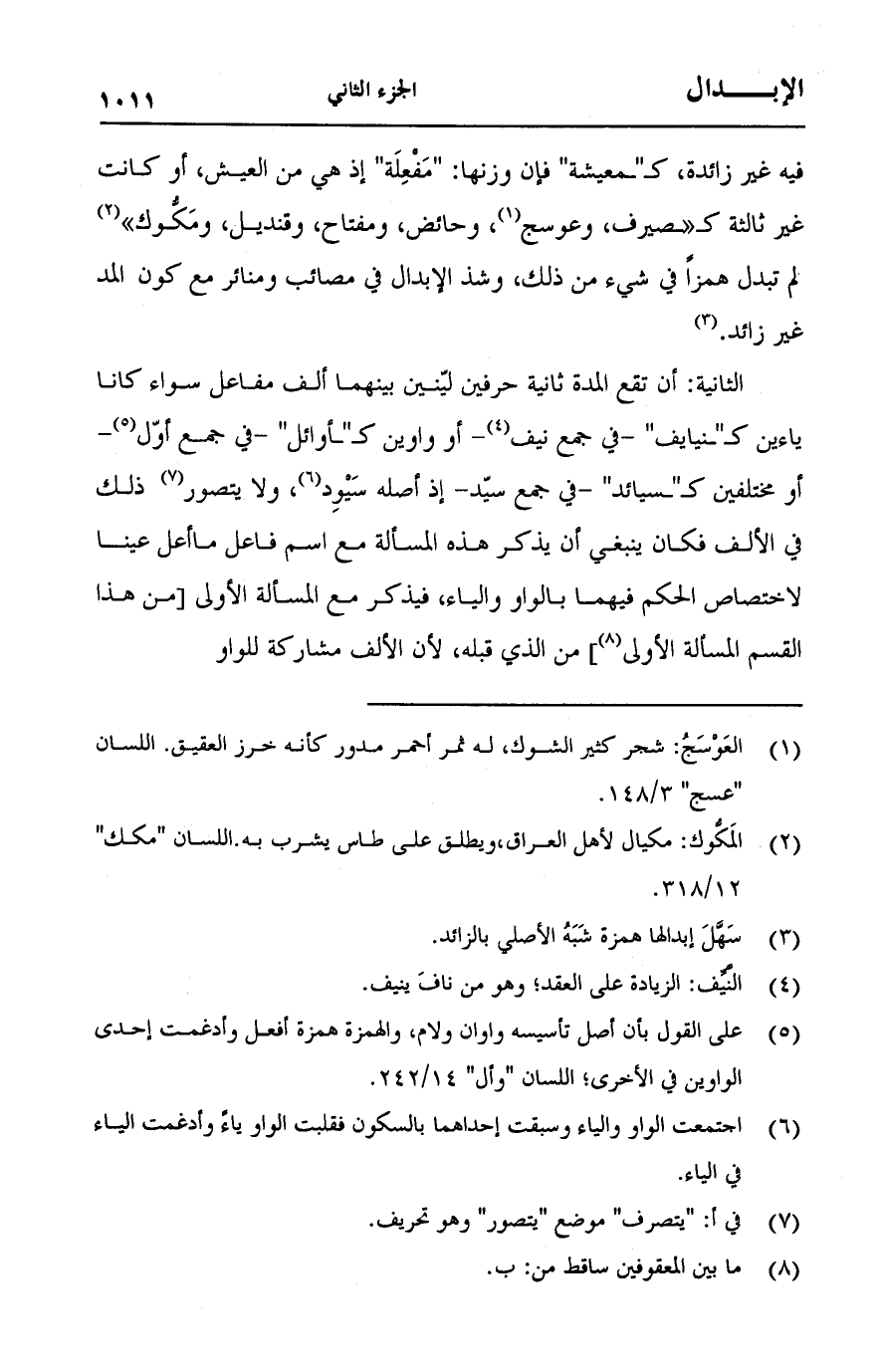 فيه غير زائدة، كـ"معيشة" فإن وزنها: "مفعلة" إذ هي من العيش، أو كانت غير ثالثة كـ"صيرف، وعوسج، وحائض، ومفتاح، وقنديل، ومكوك" لم تبدل همزاً في شيء من ذلك، وشذ الإبدال في مصائب ومنابر مع كون المد غير زائد.