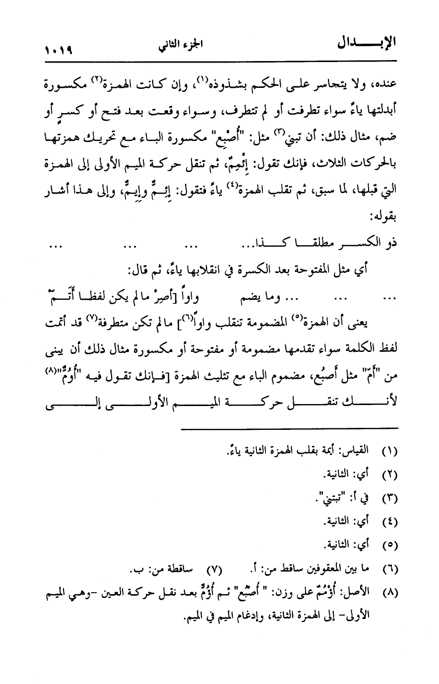 يعني أن الهمزة المضمومة تنقلب واواً] ما لم تكن متطرفة قد أتمت لفظ الكلمة سواء تقدمها مضمومة أو مفتوحة أو مكسورة مثال ذلك أن يبنى من "أم" مثل أصبع، ومضموم الباء مع تثليث الهمزة [فإنك تقول فيه "أومٌّ" لأنك تنقل حركة الميم الأولى إلى