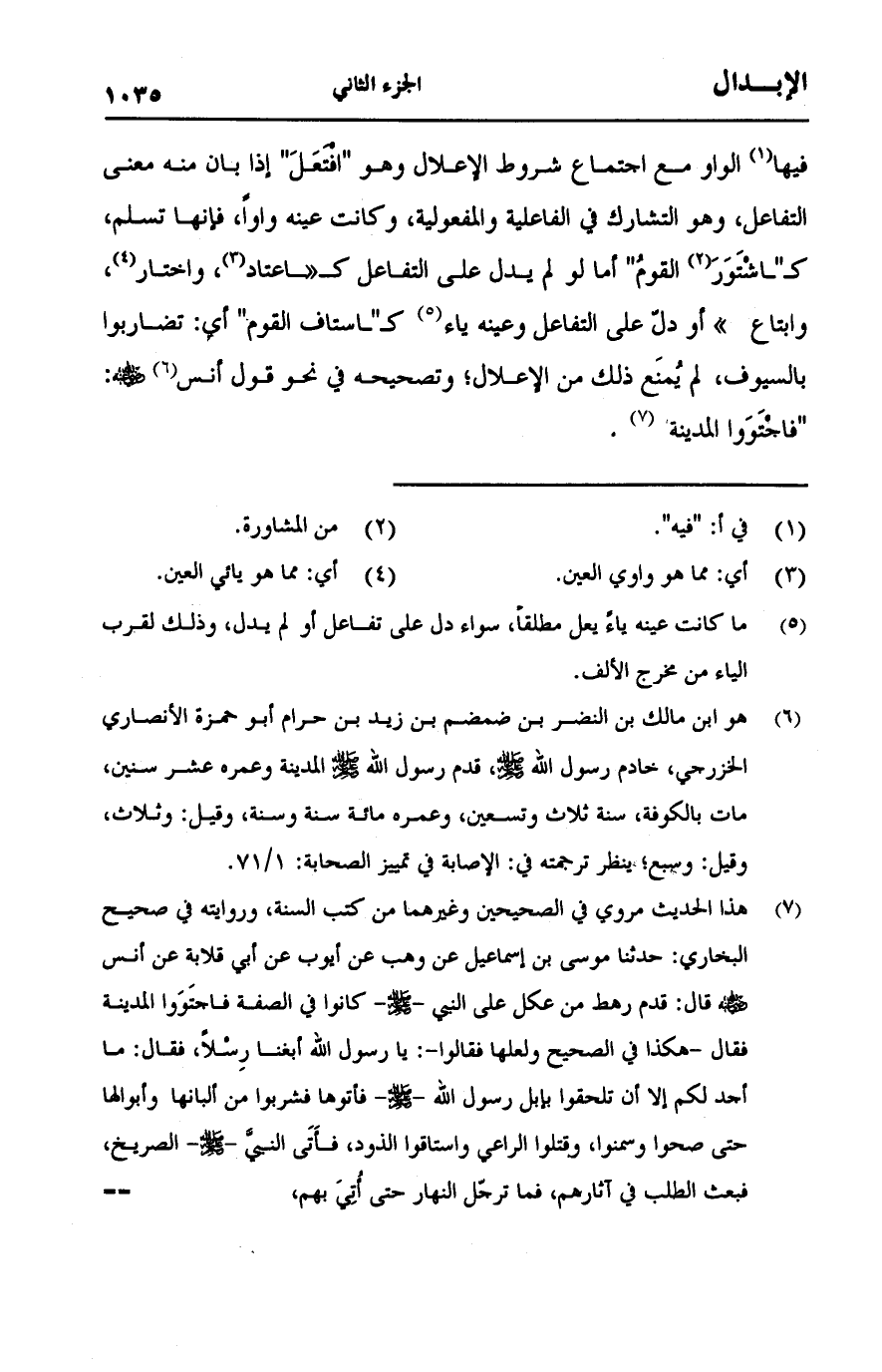 فيها الواو مع اجتماع شروط الإعلال وهو "افتعل" إذا بان منه معنى التفاعل، وهو التشارك في الفاعلية والمفعولية، وكانت عينه واواً، فإنها تسلم، كـ"اشتور القوم" أما لو لم يدل على التفاعل كـ"اعتاد، واختار، وابتاع" أو دل على التفاعل وعينه ياء كـ"استاف القوم" أي: تضاربوا بالسيوف، لم يمنع ذلك من الإعلال؛ وتصحيحه في نحو قول أنس -رضي الله عنه-: "فاجتووا المدينة".