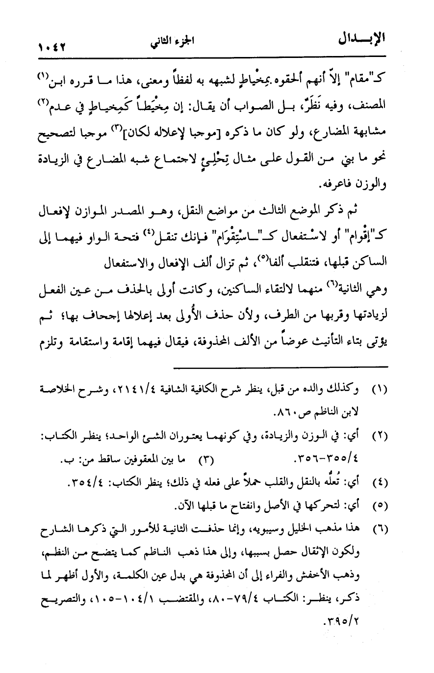 ثم ذكر الموضع الثالث من مواضع النقل، وهو المصدر الموازن لإفعال كـ"إقوام" أو لاستفعال كـ"استقوام" فإنك تنقل فتحة الواو فيهما إلى الساكن قبلها، فتنقلب ألفاً، ثم تزال ألف الإفعال والاستفعال.
