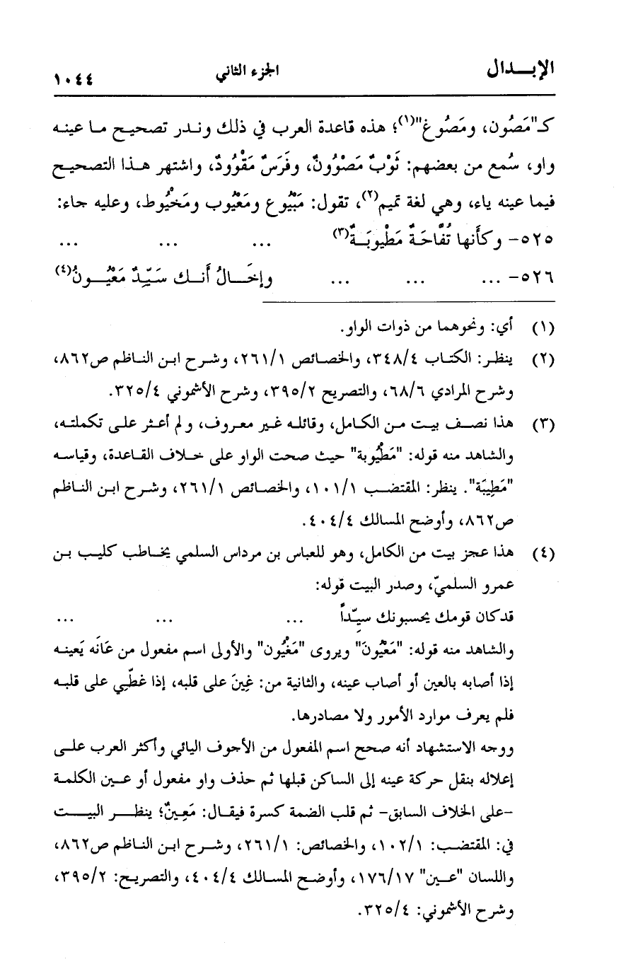 كـ"مصون، ومصوغ"؛ هذه قاعدة العرب في ذلك وندر تصحيح ما عينه واو، سمع من بعضهم: ثوبٌ مصوونٌ، وفرسٌ مقوودٌ، واشتهر هذا التصحيح فيما عينه ياء، وهي لغة تميم، تقول: مبيوع ومعيوب ومخيوط، وعليه جاء: