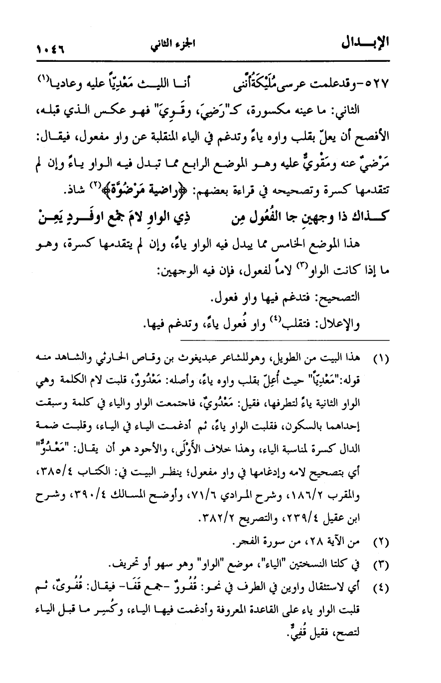 الثاني: ما عينه مكسورة، كـ"رضي، وقوي" فهو عكس الذي قبله، الأفصح أن يعل بقلب واوه ياءً وتدغم في الياء المنقلبة عن واو مفعول، فيقال: مرضيٌ عنه مقوي عليه وهو الموضع الرابع مما تبدل فيه الواو ياءً وإن لم تتقدمها كسرة وتصحيحه في قراءة بعضهم: {راضية مَرْضُوَّة} شاذ.