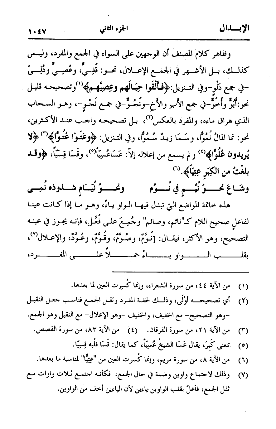 وظاهر كلام المصنف أن الوجهين على السواء في الجمع والمفرد، وليس كذلك، بل الأشهر في الجمع الإعلال، نحو: قفي، وعصي ودلي -في جمع دلو- وفي التنزيل: {حِبَالَهُمْ وَعِصِيَّهُمْ} [الشعراء:44] وتصحيحه قليل نحو: أبو وأخو -في جمع الأب والأخ- ونجو -في جمع نحوٍ-، وهو السحاب الذي هراق ماءه، والمفرد بالعكس، بل تصحيحه واجب عند الأكثرين، نحو: نما المال نموا، وسما زيدٌ سمواً، وفي التنزيل: {وَعَتَوْا عُتُوًّا} [الفرقان:21] {لا يُرِيدُونَ عُلُوًّا} [القصص:83] ولم يسمع من إعلاله إلا: عساعسياً، وقسا قيساً، {وَقَدْ بَلَغْتُ مِنَ الْكِبَرِ عِتِيًّا} [مريم:8].