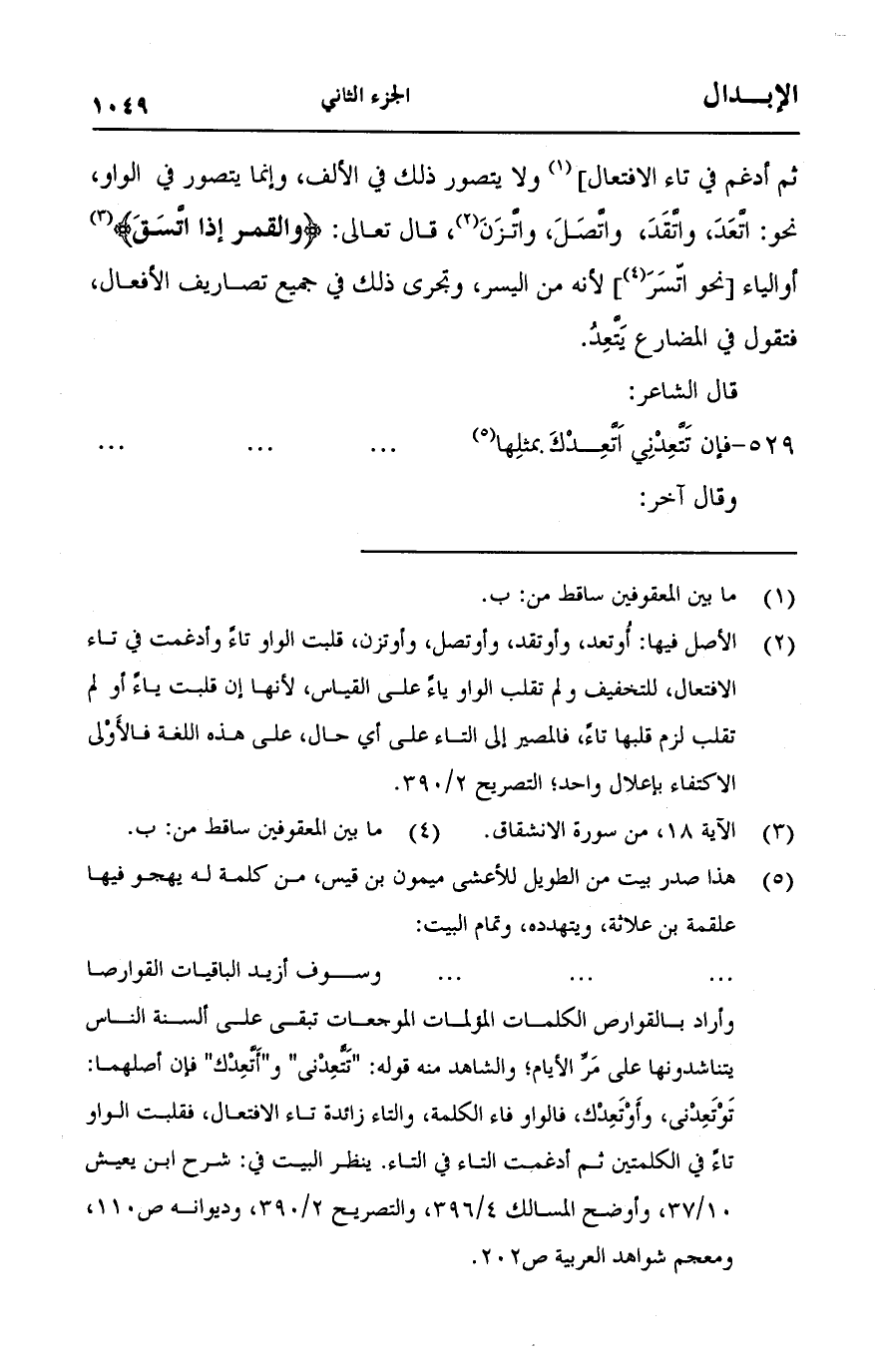 ثم أدغم في تاء الافتعال] ولا يتصور ذلك في الألف، وإنما يتصور في الواو، نحو: اتعد، واتقد، واتصل، واتزن، قال تعالى: {وَالْقَمَرِ إِذَا اتَّسَقَ} [الانشقاق:18] أو الياء [نحو اتسر] لأنه من اليسر، وتجري ذلك في جميع تصاريف الأفعال، فتقول في المضارع يتعد.