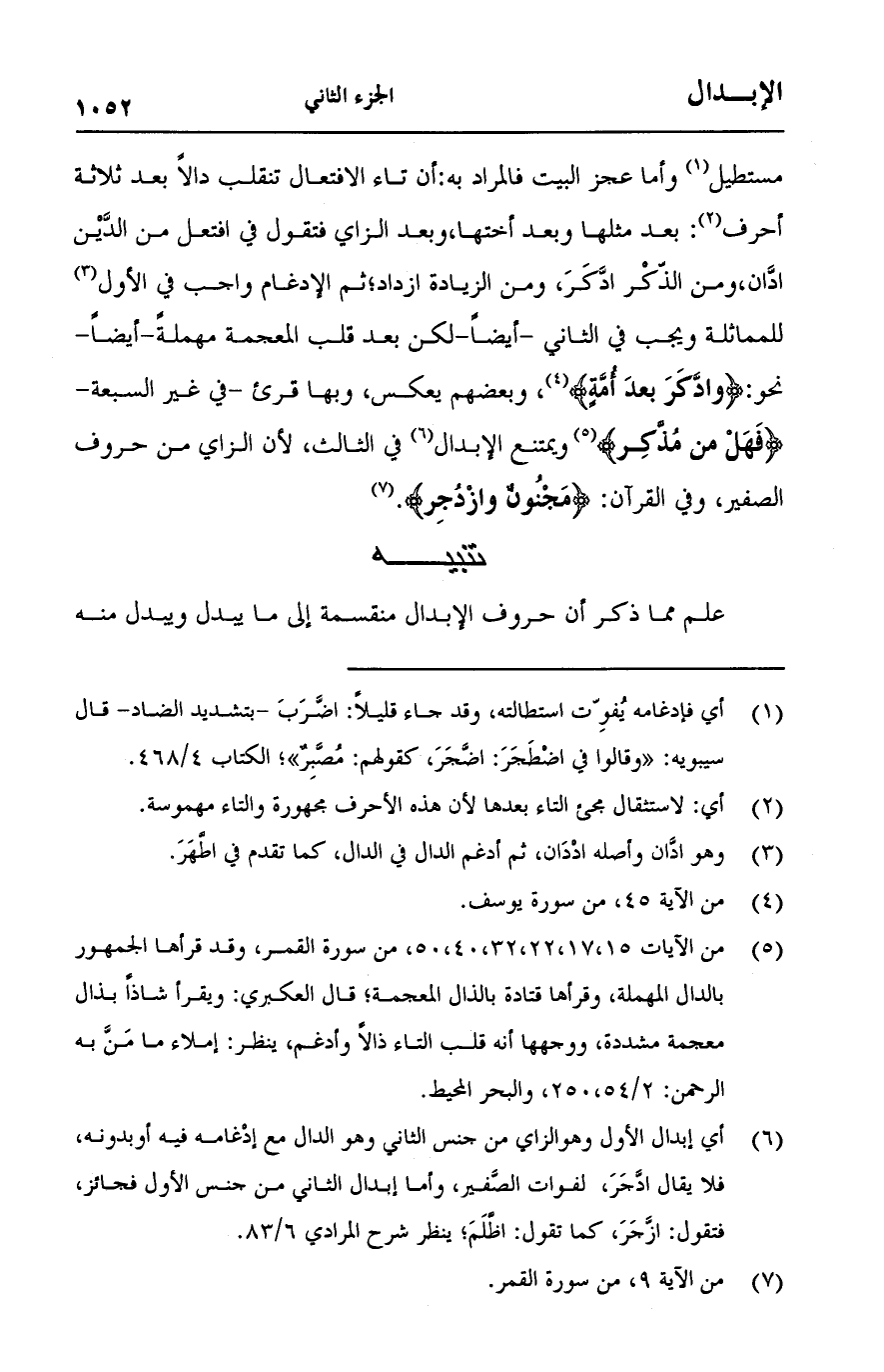 مستطيل وأما عجز البيت فالمراد به: أن تاء الافتعال تنقلب دالاً بعد ثلاثة أحرف: بعد مثلها وبعد أختها، وبعد الزاي فتقول في افتعل من الدين ادان، ومن الذكر ادكر، ومن الزيادة ازداد؛ ثم الإدغام واجب في الأول للمماثلة ويجب في الثاني- أيضاً- لكن بعد قلب المعجمة مهملةً- أيضاً- نحو: {وَادَّكَرَ بَعْدَ أُمَّةٍ} [يوسف:45]، وبعضهم يعكس، وبها قرئ - في غير السبعة- {فَهَلْ مِنْ مُدَّكِرٍ} [القمر:15] ويمتنع الإبدال في الثالث، لأن الزاي من حروف الصفير، وفي القرآن: {مَجْنُونٌ وَازْدُجِرَ} [القمر:9].