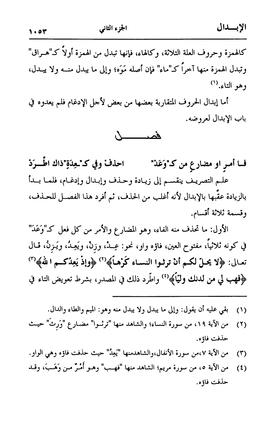 الأول: ما تحذف منه الفاء، وهو المضارع والأمر من كل فعل كـ "وعد" في كونه ثلاثياً، مفتوح العين، فاؤه واو، نحو: عد، وزن، ويعد، ويزن، قال تعالى: {لا يَحِلُّ لَكُمْ أَنْ تَرِثُوا النِّسَاءَ كَرْهًا} [النساء:19] {وَإِذْ يَعِدُكُمُ اللَّهُ} [الأنفال: 7] {فَهَبْ لِي مِنْ لَدُنْكَ وَلِيًّا} [مريم:5] واطرد ذلك في المصدر، بشرط تعويض التاء في