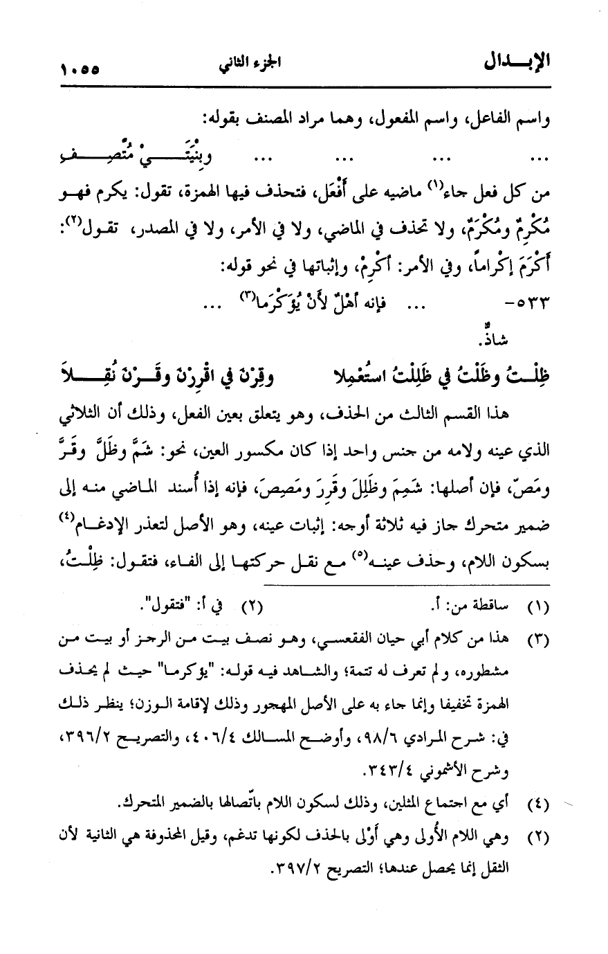 هذا القسم الثالث من الحذف، وهو يتعلق بعين الفعل، وذلك أن الثلاثي الذي عينه ولامه من جنس واحد إذا كان مكسور العين، نحو: شم وظل وقر ومص، فإن أصلها: شمم وظلل وقرر ومصص، فإنه إذا أسند الماضي منه إلى ضمير متحرك جاز فيه ثلاثة أوجه: إثبات عينه، وهو الأصل لتعذر الإدغام بسكون اللام، وحذف عينه مع نقل حركتها إلى الفاء، فتقول: ظلت،