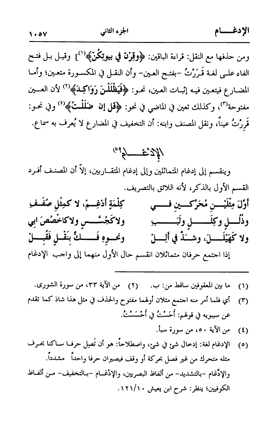 ومن حذفها مع النقل: قراءة الباقين: {وَقَرْنَ فِي بُيُوتِكُنَّ}] وقيل بل فتح الفاء على لغة قررت - بفتح العين- وأن النقل في المكسورة متعين؛ وأما المضارع فيتعين فيه إثبات العين، نحو: {فَيَظْلَلْنَ رَوَاكِدَ} [الشورى:34] لأن العين مفتوحة، وكذلك تعين في الماضي في نحو: {قُلْ إِنْ ضَلَلْتُ} [سبأ: 50] وفي نحو: قررت عيناً، ونقل المصنف وابنه: أن التخفيف في المضارع لا يعرف به سماع.