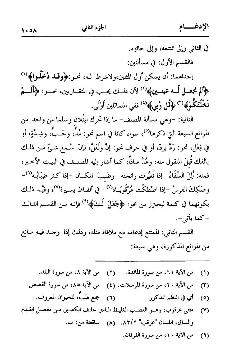 القسم الثاني: الممتنع إدغامه مع ملاقاة مثله، وذلك إذا وجد فيه مانع من الموانع المذكورة، وهي سبعة: