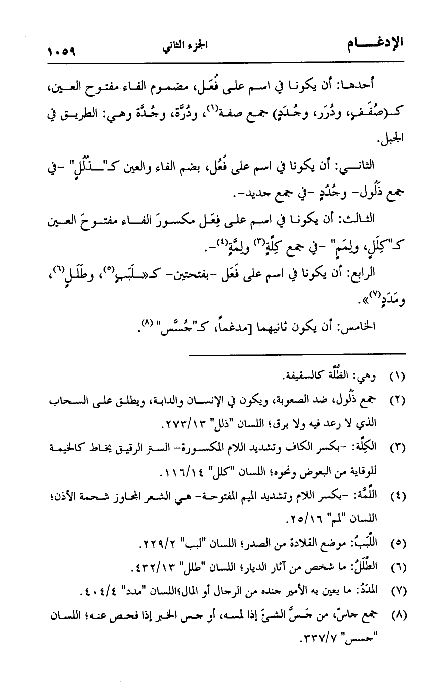 الثاني: أن يكونا في اسم على فعل، بضم الفاء والعين كـ "ذللٍ" - في جمع ذلول- وجددٍ - في جمع جديد-