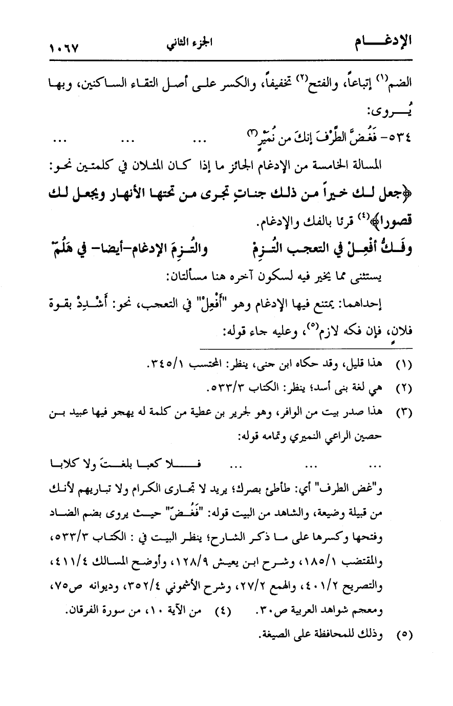 المسألة الخامسة من الإدغام الجائز ما إذا كان المثلان في كلمتين نحو: {جَعَلَ لَكَ خَيْرًا مِنْ ذَلِكَ جَنَّاتٍ تَجْرِي مِنْ تَحْتِهَا الأَنْهَارُ وَيَجْعَلْ لَكَ قُصُورًا} [الفرقان:10] قرئا بالفك والإدغام.