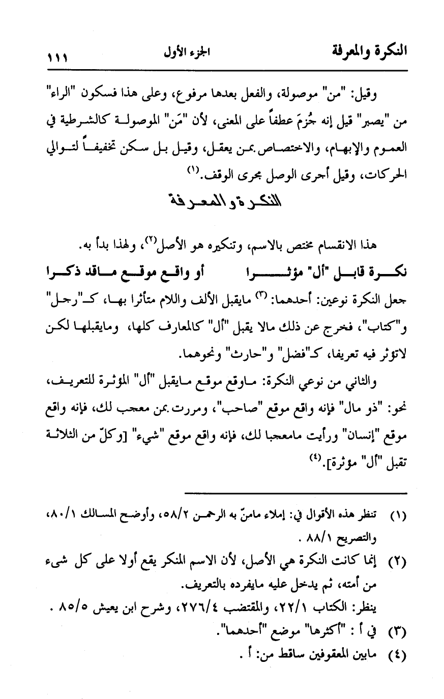 جعل النكرة نوعين: أحدهما: ما يقبل الألف واللام متأثرا بها، كـ"رجل" و"كتاب"، فخرج عن ذلك ما لا يقل "أل" كالمعارف كلها، وما يقبلها لكن لا تؤثر فيه تعريفا، كـ"فضل" و "حارث" ونحوهما.