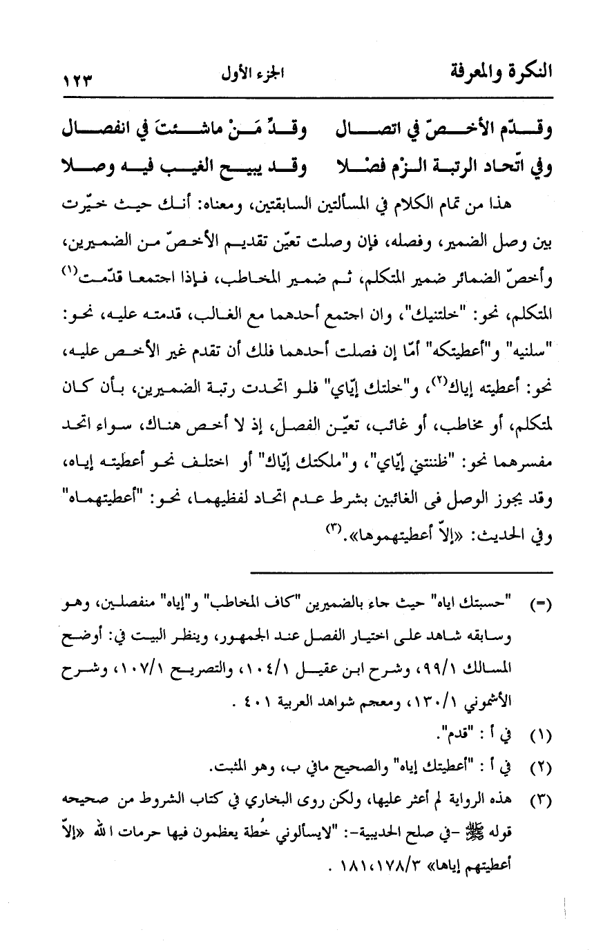 هذا من تمام الكلام في المسألتين السابقتين، ومعناه: أنك حيث خيرت بين وصل الضمير، وفصله، فإن وصلت تعين تقديم الأخص من الضميرين، وأخص الضمائر ضمير المتكلم، ثم ضمير المخاطب، فإذا اجتمعا قدمت المتكلم، نحو: "خلتنيك"، وان اجتمع أحدهما مع الغالب، قدمته عليه، نحو: "سلنيه" و "أعطيتكه" أما إن فصلت أحدهما فلك أن تقدم غير الأخص عليه، نحو: أعطيته إياك, و"خلتك إياي" فلو اتحدث رتبة الضميرين، بأن كان لمتكلم، أو مخاطب، أو غائب، تعين الفصل، إذ لا أخص هناك، سواء اتحد مفسرهما نحو: "ظننتني إياي"، و "ملكتك إياك" أو اختلف نحو أعطيته إياه، وقد يجوز الوصل في الغائبين بشرط عدم اتحاد لفظيهما، نحو: "أعطيتهماه" وفي الحديث: "إلا أعطيتهموها".