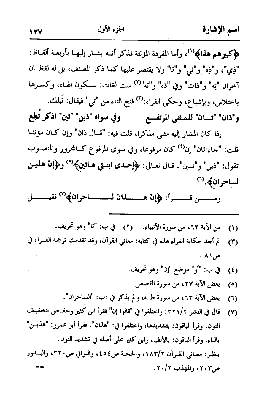 إذا كان المشار إليه مثنى مذكراً، قلت فيه: "قال ذان" وإن كان مؤنثاً قلت: "جاء تان" إن كان مرفوعاً، وفي سوى المرفوع كالمجرور والمنصوب تقول: "ذين" و "تين". قال تعالى: {إحدى ابنتي هاتينِ} (القصص: 27) و {إنَّ هذين لساحرانِ} (طه: 63).