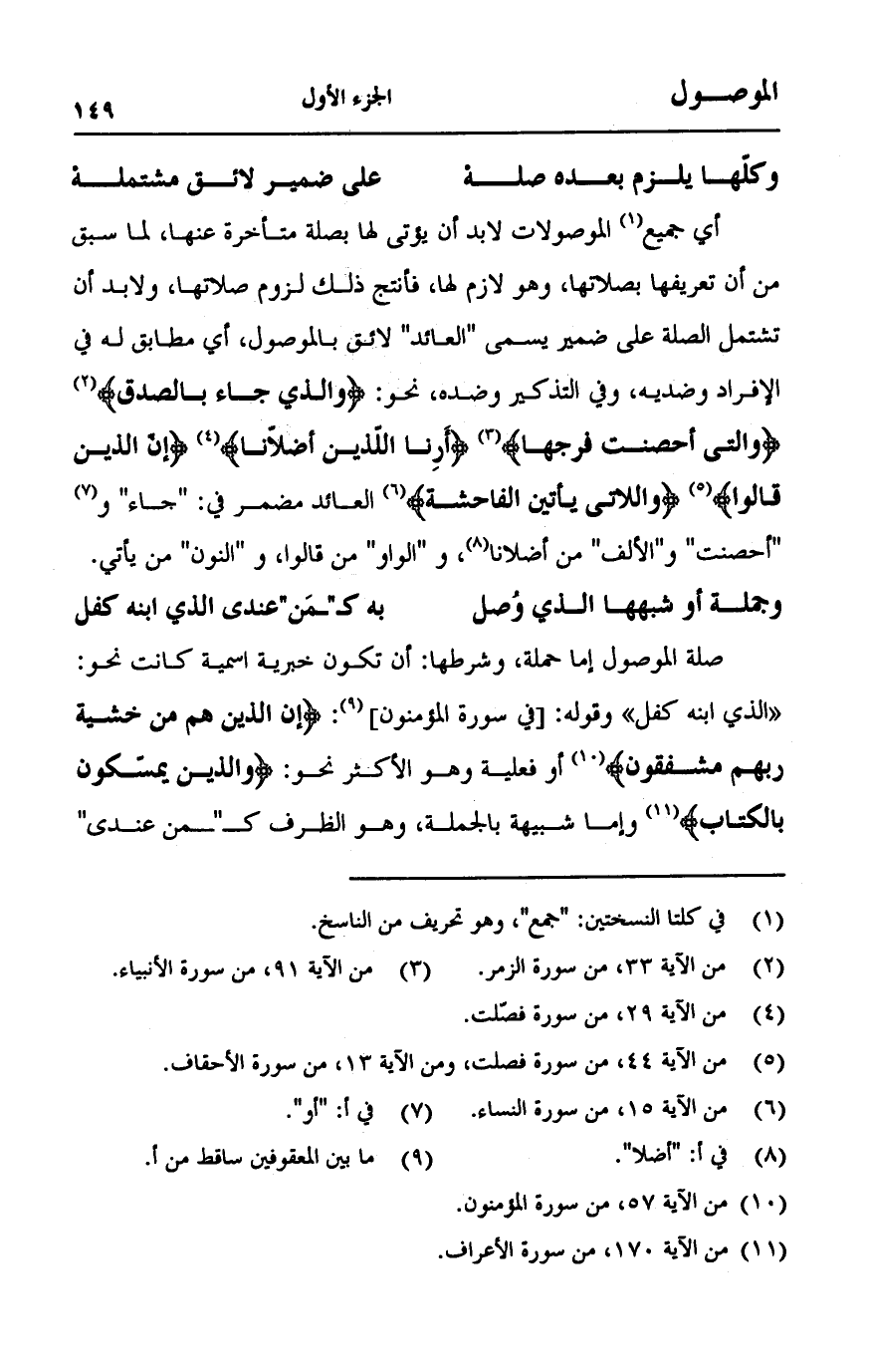 أي جميع الموصولات لابد أن يؤتى لها بصلة متأخرة عنها، لما سبق من أن تعريفها بصلاتها، وهو لازم لها، فأنتج ذلك لزوم صلاتها، ولابد أ، تشتمل الصلة على ضمير يسمى "العائد" لائق بالموصول، أي مطابق له في الإفراد وضديه، وفي التذكير وضده، نحو: {والذي جاء بالصدق} [الزمر:33] {والتي أحصنت فرجها} [الأنبياء:91] {أرنا اللذين أضلانا} [فصلت:29] {إن الذين قالوا} [فصلت:44] [الأحقاف:13] {واللاتي يأتين الفاحشة} [النساء:15] العائد مضمر في: "جاء" و "أحصنت" و "الألف " من أضلانا، و "الواو" من قالوا، و "النون" من يأتي.