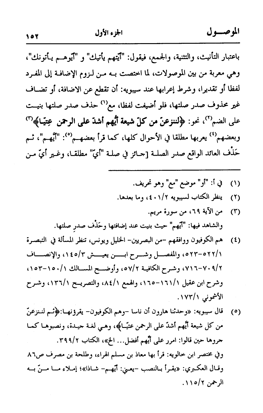 باعتبار التأنيث، والتثنية، والجمع، فيقول: (أيتهم يأتيك) و (أيوهم يأتونك)، وهي معربة من بين الموصلات، لما اختصت به من لزوم الإضافة إلى المفرد لفظا أو تقديرا، وشرط إعرابها عند سيبويه: أن تقطع عن الإضافة، أو تضاف غير محذوف صدر صلتها، فلو أضيفت لفظا، مع حذف صدر صلتها بنيت على الضم، نحو: {ثُمَّ لَنَنزِعَنَّ مِنْ كُلِّ شِيعَةٍ أَيُّهُمْ أَشَدُّ عَلَى الرَّحْمَنِ عِتِيًّا} [مريم:69] وبعضهم يعربها مطلقا في الأحوال كلها، كما قرأ بعضهم: "أيهم"، ثم حذف العائد الواقع صدر الصلة [جائز في صلة "أي" مطلقا، وغير أي من