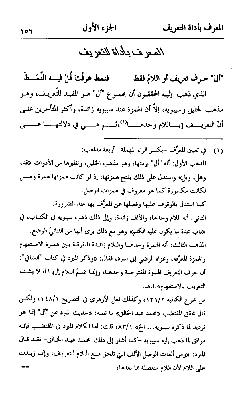 الذي ذهب إليه المحققون أن مجموع: أل" هو المفيد للتعريف، وهو مذهب الخليل وسيبويه، إلا أن الهمزة عند سيبويه زائدة، وأكثر المتأخرين على أن التعريف [باللام وحدها، ثم هي في دلالتها على