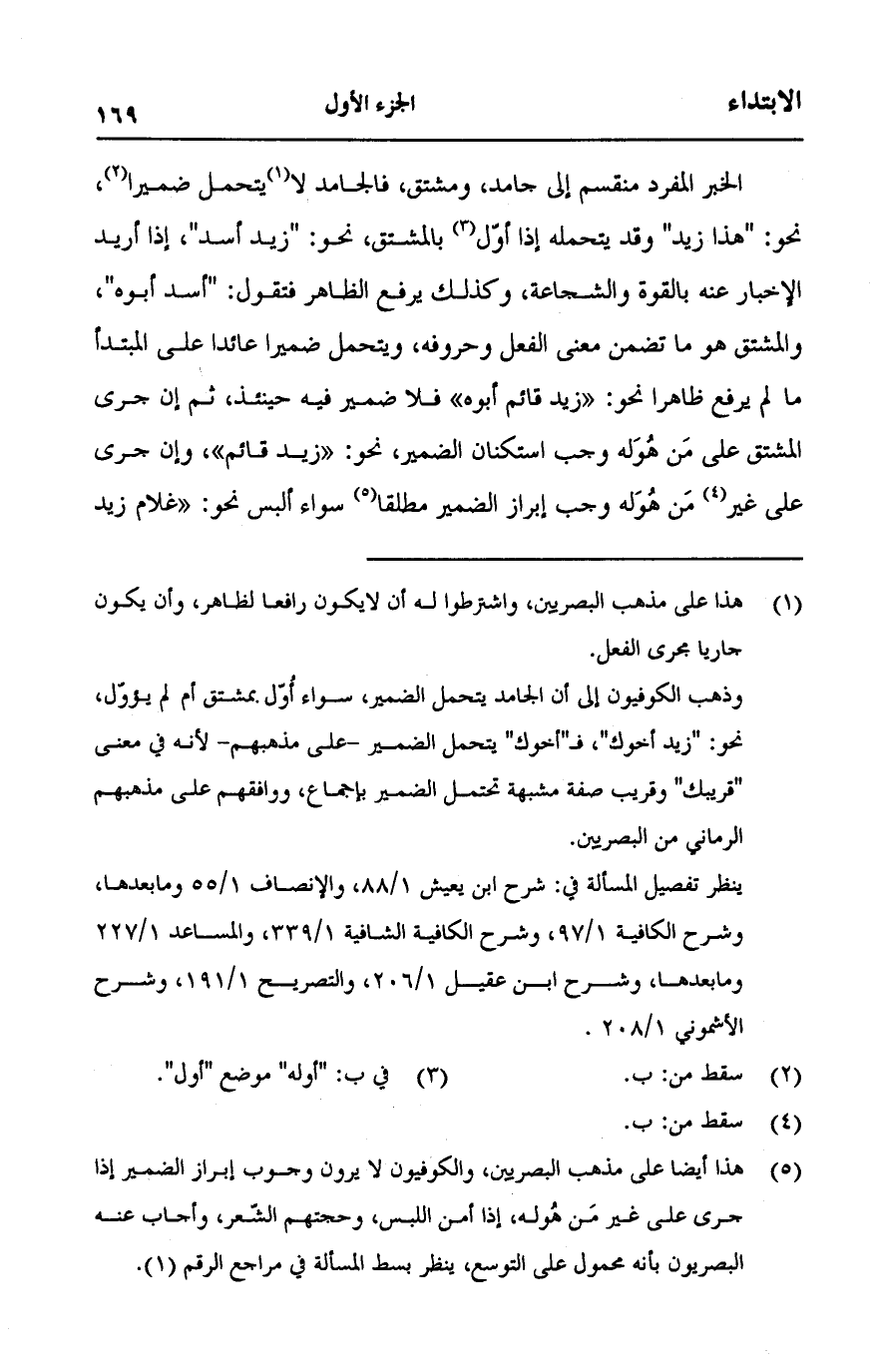 الخبر المفرد منقسم إلى جامد، ومشتق، فالجامد لا يتحمل ضميرا، نحو: "هذا زيد" وقد يتحمله إذا أول بالمشتق، نحو: "زيد أسد"، إذا أريد الإخبار عنه بالقوة والشجاعة، وكذلك يرفع الظاهر فتقول: "أسد أبوه"، والمشتق هو ما تضمن معنى الفعل وحروفه، ويتحمل ضميرا عائدا على المبتدأ ما لم يرفع ظاهرا نحو: "زيد قائم أبوه" فلا ضمير فيه حينئذ، ثم إن جرى المشتق على من هوله وجب استكنان الضمير، نحو: "زيد قائم" وإن جرى على غير من هوله وجب إبراز الضمير مطلقا سواء ألبس نحو "غلام زيد