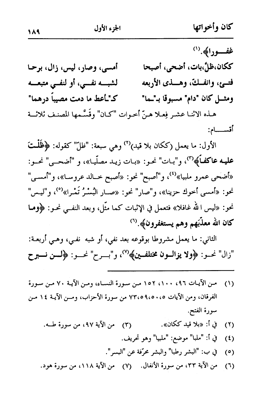 الأول: ما يعمل (ككان بلا قيد) وهي سبعة: "ظل" كقوله: {ظَلْتَ عَلَيْهِ عَاكِفًا} [طه:97]، و"بات" نحو: "بات زيد مصليا"، و"أضحى" نحو: "أضحى عمرو ملبيا"، و"أصبح" نحو: "أصبح خالد عروسا"، و"أمسى" نحو: "أمسى أخوك حزينا"، و"صار" نحو: "صار البسر تمرا"، و"ليس" نحو: "ليس الله غافلا" فتعمل في الإثبات كما مثل، وبعد النفي نحو: {وَمَا كَانَ اللَّهُ مُعَذِّبَهُمْ وَهُمْ يَسْتَغْفِرُونَ} [الأنفال:33].
