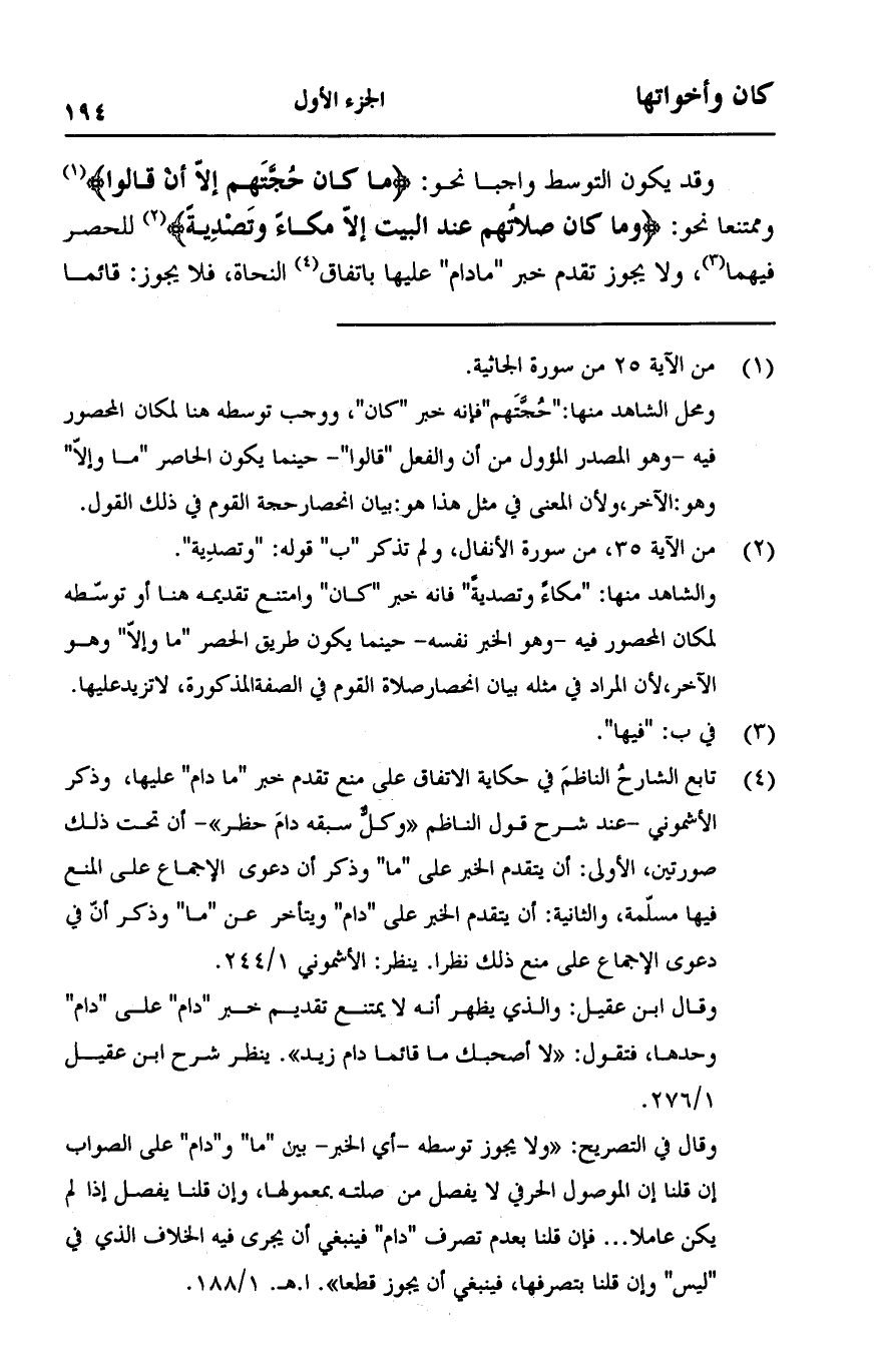 وقد يكون التوسط واجبا نحو: {مَا كَانَ حُجَّتَهُمْ إِلَّا أَنْ قَالُوا} [الجاثية:25] وممتنعا نحو: {وَمَا كَانَ صَلاتُهُمْ عِنْدَ الْبَيْتِ إِلَّا مُكَاءً وَتَصْدِيَةً} [الأنفال:35] للحصر فيهما، ولا يجوز تقدم خبر "مادام" عليها باتفاق النحاة، فلا يجوز: قائما
