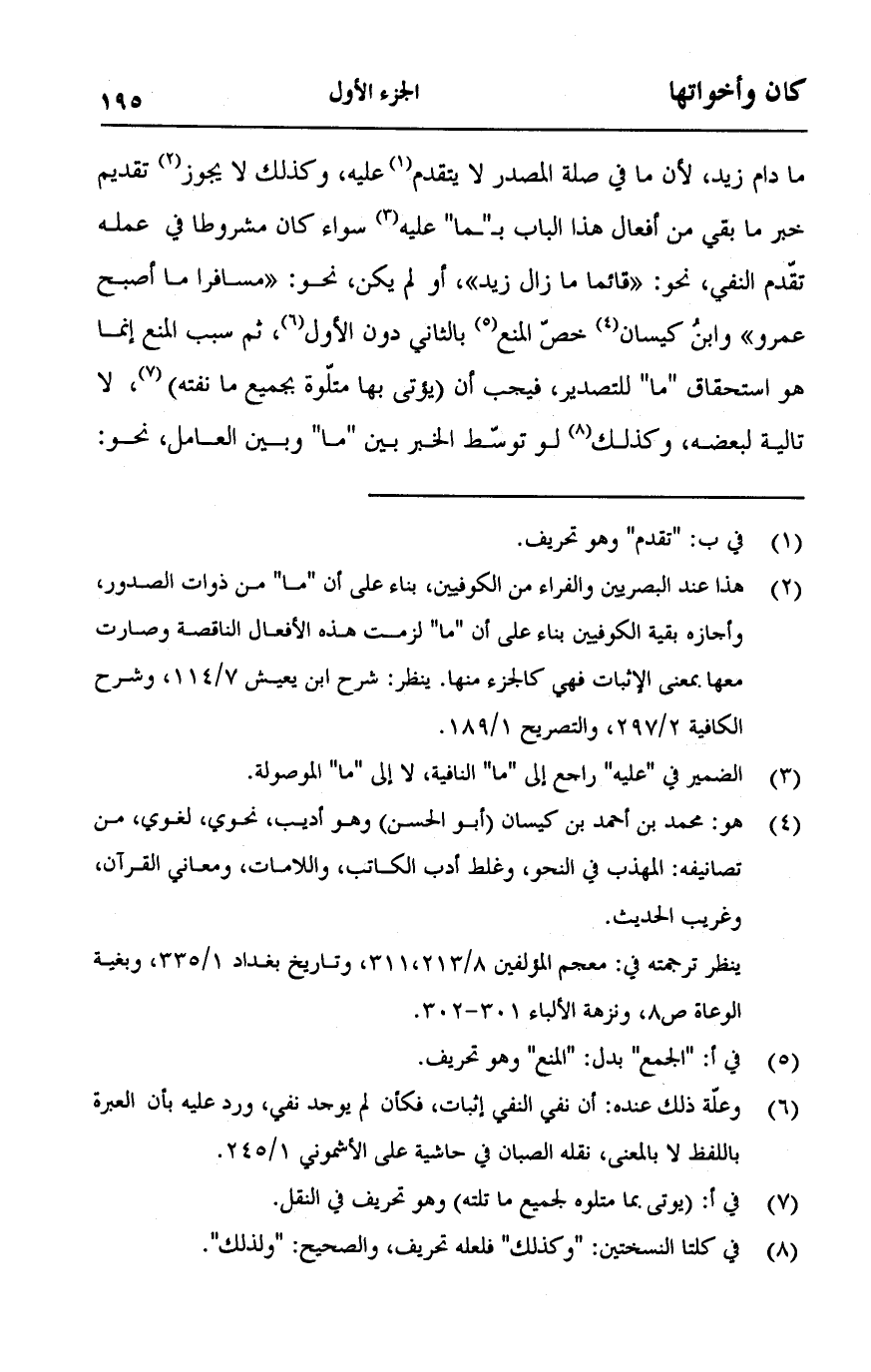 مادام زيد، لأن ما في صلة المصدر لا يتقدم عليه، وكذلك لا يجوز تقديم خبر ما بقي من أفعال هذا الباب بـ"ما" عليه سواء كان مشروطا في عمله تقدم النفي، نحو: "قائما ما زال زيد"، أو لم يكن، نحو: "مسافرا ما أصبح عمرو" وابن كيسان خص المنع بالثاني دون الأول، ثم سبب المنع إنما هو استحقاق "ما" للتصدير، فيجب أن (يؤتى بها متلوة بجميع ما نفته)، لا تالية لبعضه، وكذلك لو توسط الخبر بين "ما" وبين العامل، نحو: