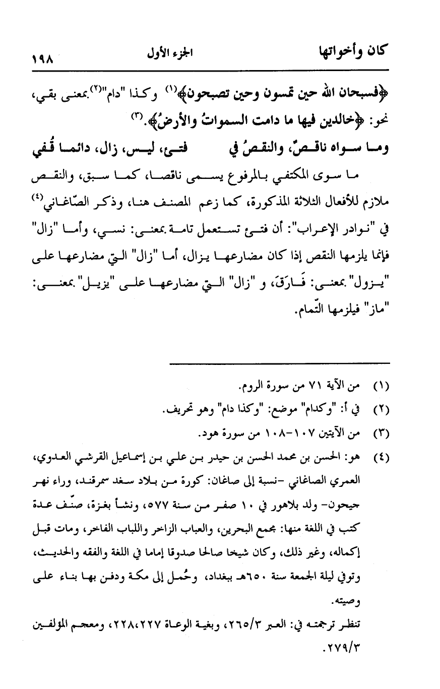{فَسُبْحَانَ اللَّهِ حِينَ تُمْسُونَ وَحِينَ تُصْبِحُونَ} [الروم:17] وكذا "دام" بمعنى بقي، نحو: {خَالِدِينَ فِيهَا مَا دَامَتِ السَّمَوَاتُ وَالأَرْضُ} [هود:107].