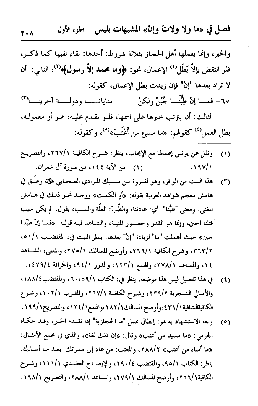 والخبر، وإنما يعملها أهل الحجاز بثلاثة شروط: أحدها: بقاء نفيها كما ذكر، فلو انتقض بإلا بطل الإعمال، نحو: {وَمَا مُحَمَّدٌ إِلَّا رَسُولٌ} [آل عمران:144]، الثاني: أن لا تزاد بعدها "إن" فإن زيدت بطل الإعمال، كقوله: