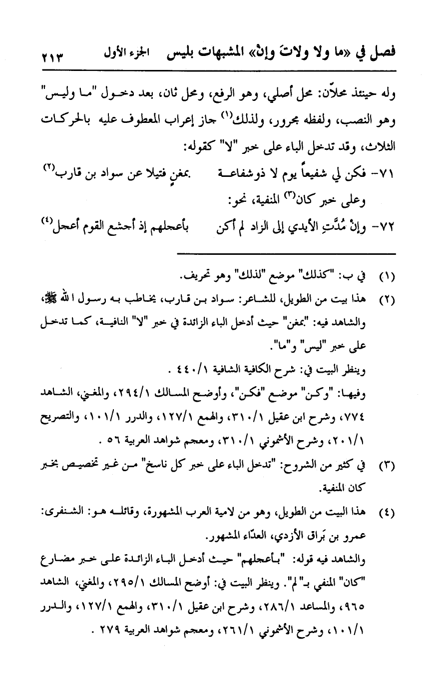 وله حينئذ محلان: محل أصلي، وهو الرفع، ومحل ثان، بعد دخول "ما وليس" وهو النصب، ولفظه مجرور، ولذلك جاز إعراب المعطوف عليه بالحركات الثلاث، وقد تدخل الباء على خبر "لا" كقوله: