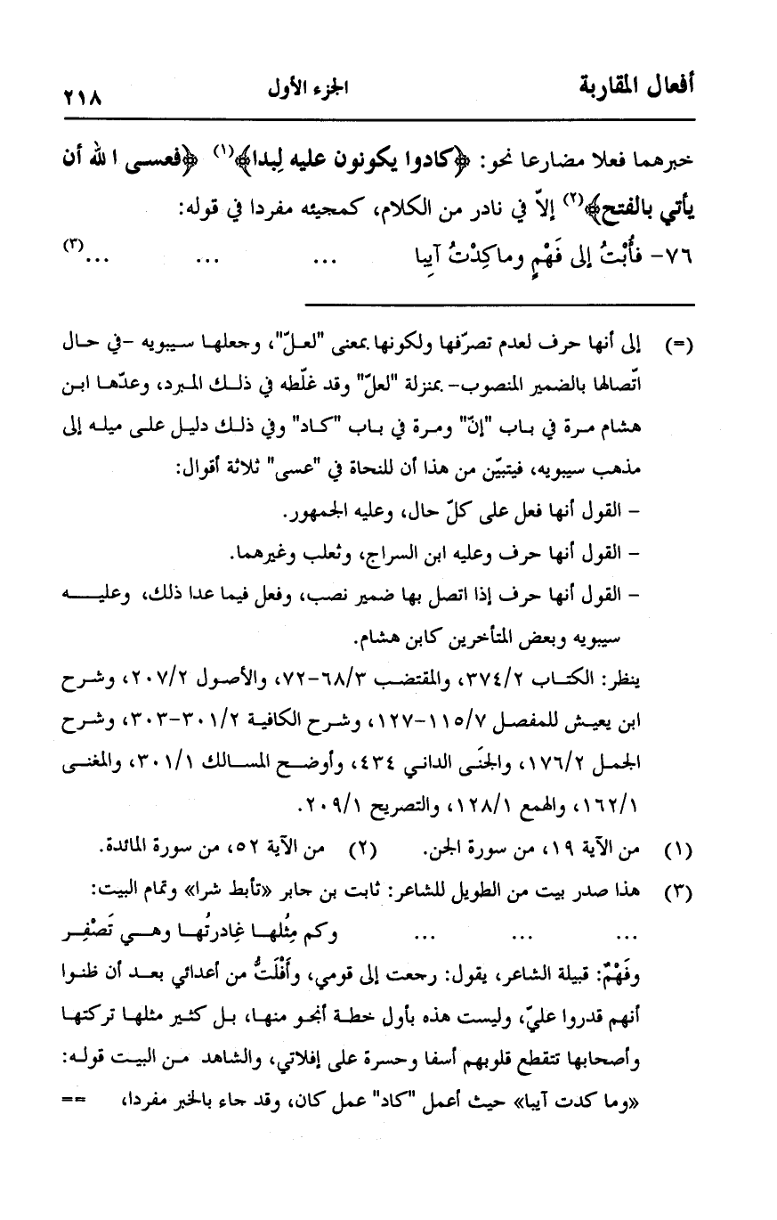 خبرهما فعلا مضارعا نحو: {كَادُوا يَكُونُونَ عَلَيْهِ لِبَدًا} [الجن:19] {فَعَسَى اللَّهُ أَنْ يَأْتِيَ بِالْفَتْحِ} [المائدة:52] إلا في نادر من الكلام، كمجيئه مفردا في قوله:
