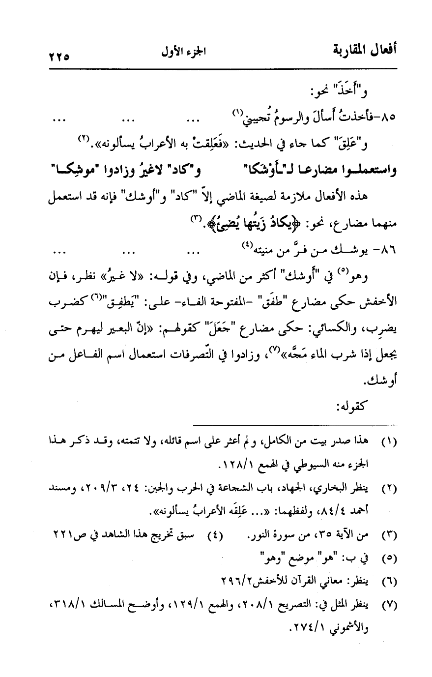 وهو في "أوشك" أكثر من الماضي، وفي قوله: "لا غير" نظر، فإن الأخفش حكي مضارع "طفق" - المفتوحة الفاء- على: "يطفق" كضرب يضرب، والكسائي: حكي مضارع "جعل" كقولهم: "إن البعير ليهرم حتى يجعل إذا شرب الماء مجه"، وزادوا في التصرفات استعمال اسم الفاعل من أوشك.