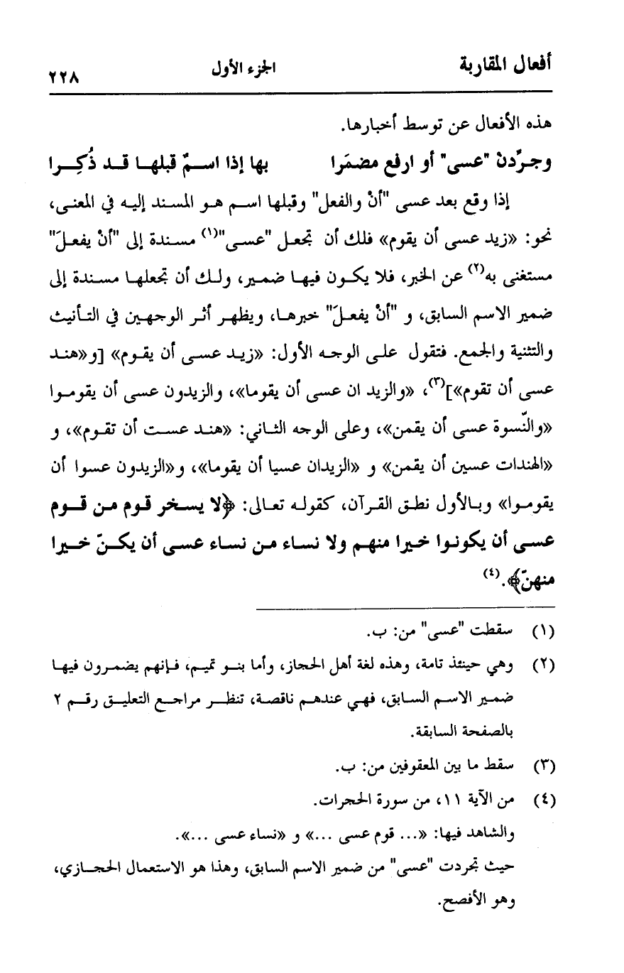 إذا وقع بعد عسى "أن والفعل" وقبلها اسم هو المسند إليه في المعنى، نحو: "زيد عسى أن يقوم" فلك أن تجعل "عسى" مسندة إلى "أن يفعل" مستغنى به عن الخبر، فلا يكون فيها ضمير، ولك أن تجعلها مسندة إلى ضمير الاسم السابق، و"أن يفعل" خبرها، ويظهر أثر الوجهين في التأنيث والتثنية والجمع. فتقول على الوجه الأول: "زيد عسى أن يقوم" [و "هند عسى أن تقوم"]، "والزيد أن عسى أن يقوما"، والزيدون عسى أن يقوموا "والنسوة عسى أن يقمن"، وعلى الوجه الثاني: "هند عست أن تقوم"، و "الهندات عسين أن يقمن" و "الزيدان عسيا أن يقوما"، و "الزيدون عسوا أن يقوموا" وبالأول نطق القرآن، كقوله تعالى: {لا يَسْخَرْ قَومٌ مِنْ قَوْمٍ عَسَى أَنْ يَكُونُوا خَيْرًا مِنْهُمْ وَلا نِسَاءٌ مِنْ نِسَاءٍ عَسَى أَنْ يَكُنَّ خَيْرًا مِنْهُنَّ}