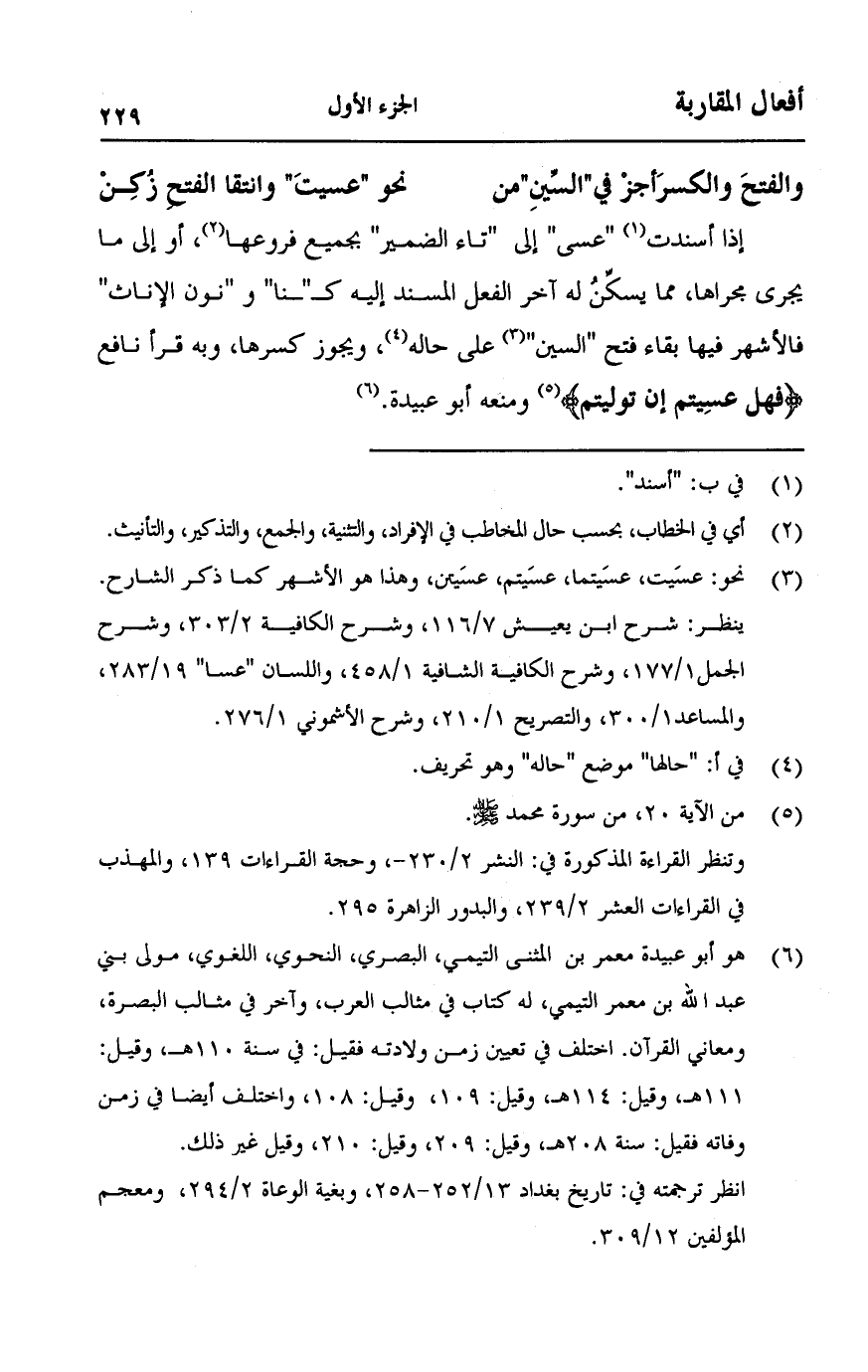 إذا أسندت "عسى" إلى "تاء الضمير" بجميع فروعها، أو إلى ما يجري مجراها، مما يسكن له آخر الفعل المسند إليه كـ"نا" و"نون الإناث" فالأشهر فيها بقاء فتح "السين" على حاله، ويجوز كسرها، وبه قرأ نافع {فَهَلْ عَسَيْتُمْ إِنْ تَوَلَّيْتُمْ} [محمد:22] ومنعه أبو عبيدة.