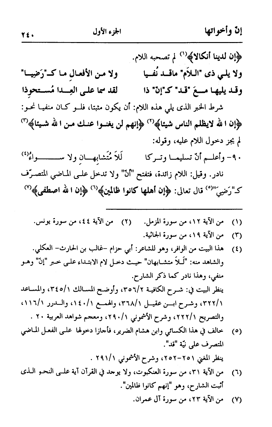 نادر. وقيل: اللام زائدة، فتفتح "أن" ولا تدخل على الماضي المتصرف كـ"رضي" قال تعالى: {إِنَّ أَهْلَهَا كَانُوا ظَالِمِينَ} [العنكبوت:31] {إِنَّ اللَّهَ اصْطَفَى}