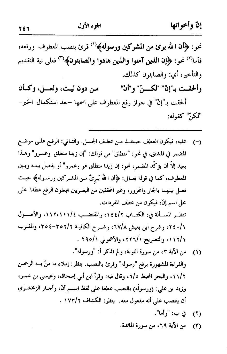 نحو: {أَنَّ اللَّهَ بَرِيءٌ مِنَ الْمُشْرِكِينَ وَرَسُولُهُ} [التوبة:3] قرئ بنصب المعطوف ورفعه، فأما نحو: {إِنَّ الَّذِينَ آمَنُوا وَالَّذِينَ هَادُوا وَالصَّابِئُونَ} [المائدة:69] فعلى نية التقديم والتأخير، أي: والصابئون كذلك.