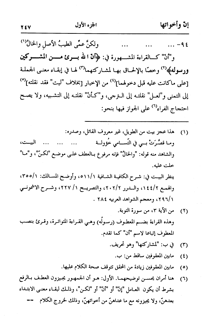 و"أن" كالقراءة المشهورة في: {أَنَّ اللَّهَ بَرِيءٌ مِنَ الْمُشْرِكِينَ وَرَسُولُهُ} [التوبة:3] وخصا بالإلحاق بها لمشاركتهما لها في إبقاء معنى الجملة [على ما كانت عليه قبل دخولهما] من الإخبار [بخلاف"ليت" فقد نقلته] إلى التمني و"لعل" نقلته إلى الترجي، و"كأن" نقلته إلى التشبيه، ولا يصح احتجاج الفراء على الجواز فيها بنحو: