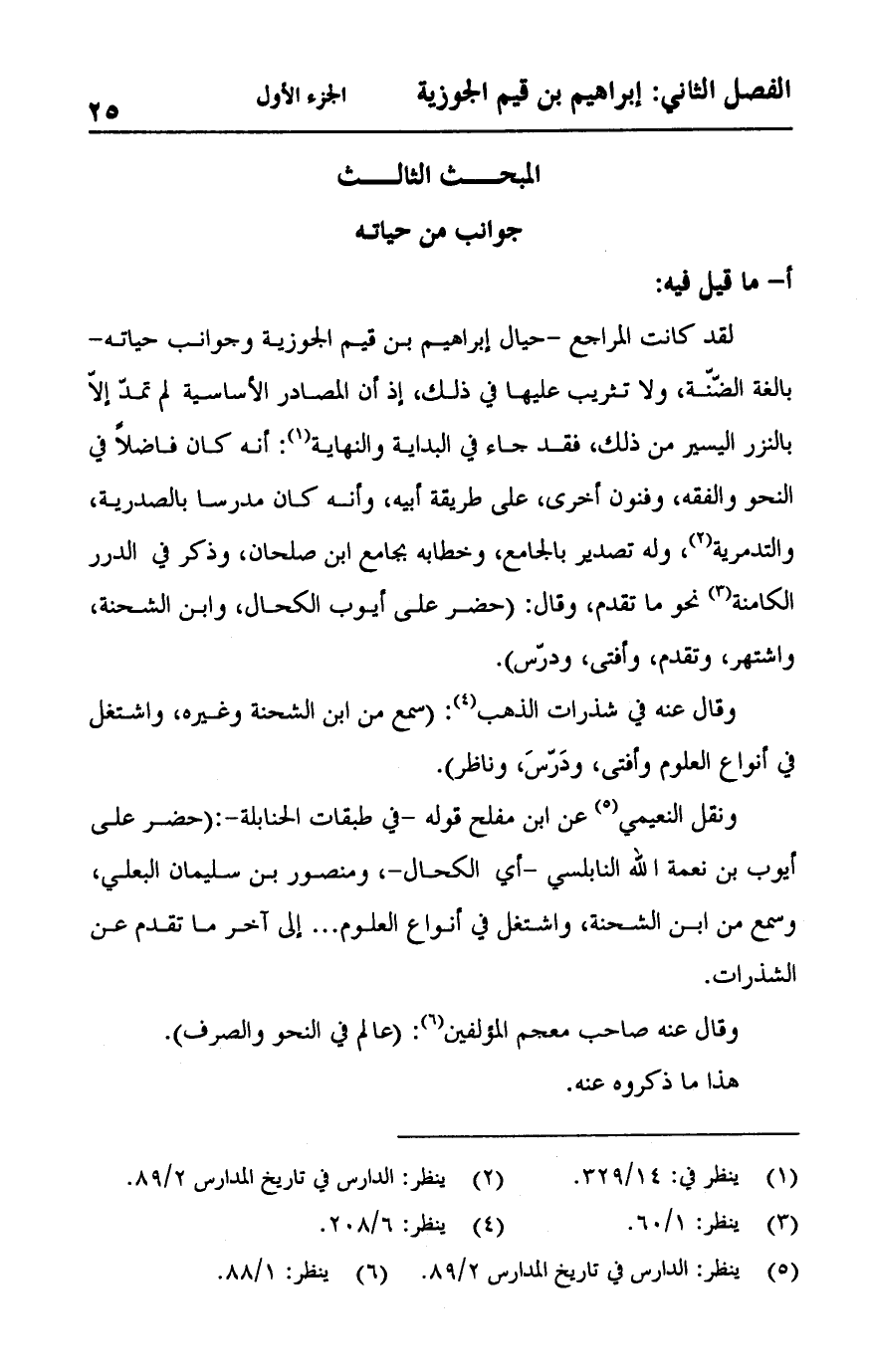لقد كانت المراجع حيال إبراهيم بن قيم الجوزية وجوانب حياته- بالغة الضنة، ولا تثريب عليها في ذلك، إذ أن المصادر الأساسية لم تمد إلا بالنزر اليسير من ذلك، فقد جاء في البداية والنهاية: أنه كان فاضلاً في النحو والفقه، وفنون أخرى، على طريقة أبيه، وأنه كان مدروسا بالصدرية، والتدمرية، وله تصدير بالجامع، وخطابه بجامع ابن صلحان، وذكر في الدرر الكامنة نحو ما تقدم، وقال: (حضر على أيوب الكحال، وابن الشحنة، واشتهر، وتقدمن وأفتى، ودرس).