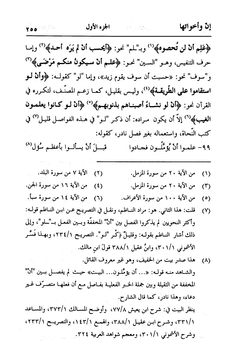 {عَلِمَ أَنْ لَنْ تُحْصُوهُ} [المزمل:20] وبـ"لم" نحو: {أَيَحْسَبُ أَنْ لَمْ يَرَهُ أَحَدٌ} [البلد:7] وإما حرف التنفيس، وهو "السين" نحو: {عَلِمَ أَنْ سَيَكُونُ مِنْكُمْ مَرْضَى} [المزمل:20] و"سوف" نحو: "حسبت أن سوف يقوم زيد"، وإما "لو" كقوله: {وَأَلَّوِ اسْتَقَامُوا عَلَى الطَّرِيقَةِ} [الجن:16]، وليس بقليل، كما زعم المصنف، لتكرره في القرآن نحو: {أَنْ لَوْ نَشَاءُ أَصَبْنَاهُمْ بِذُنُوبِهِمْ} [الأعراف:100] {أَنْ لَوْ كَانُوا يَعْلَمُونَ الْغَيْبَ} [سبأ:14] إلا أن يكون مراده: أن ذكر "لو" في هذه الفواصل قليل في كتب النحاة، واستعماله بغير فصل نادر، كقوله: