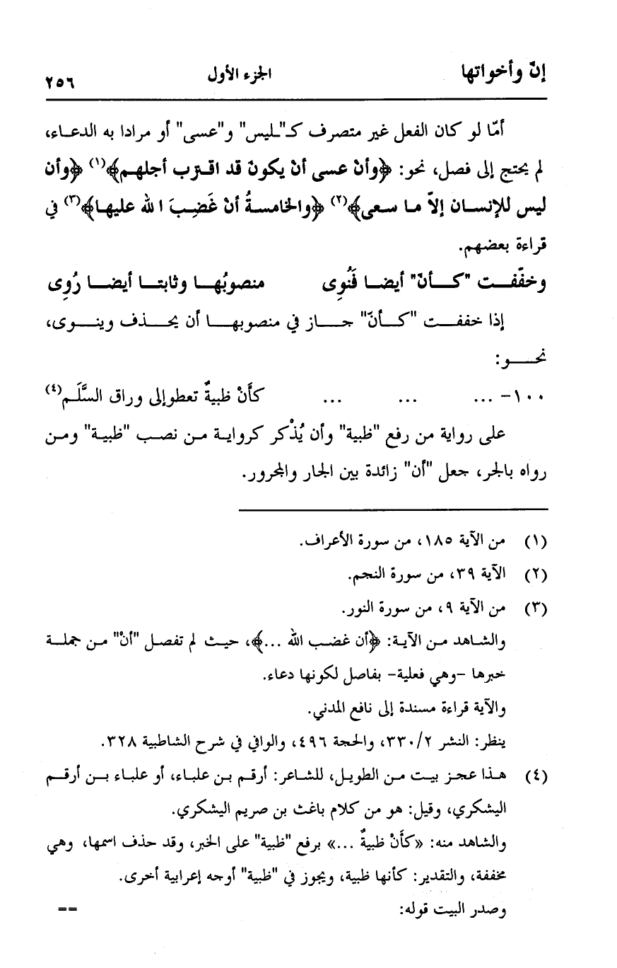 أما لو كان الفعل غير متصرف كـ"ليس" و"عسى" أو مرادا به الدعاء، لم يحتج إلى فصل، نحو: {وَأَنْ عَسَى أَنْ يَكُونَ قَدِ اقْتَرَبَ أَجَلُهُمْ} [الأعراف:185] {وَأَنْ لَيْسَ لِلإِنسَانِ إِلَّا مَا سَعَى} [النجم:39] {وَالْخَامِسَةَ أَنَّ غَضَبَ اللَّهِ عَلَيْهَا} [النور:9] في قراءة بعضهم.
