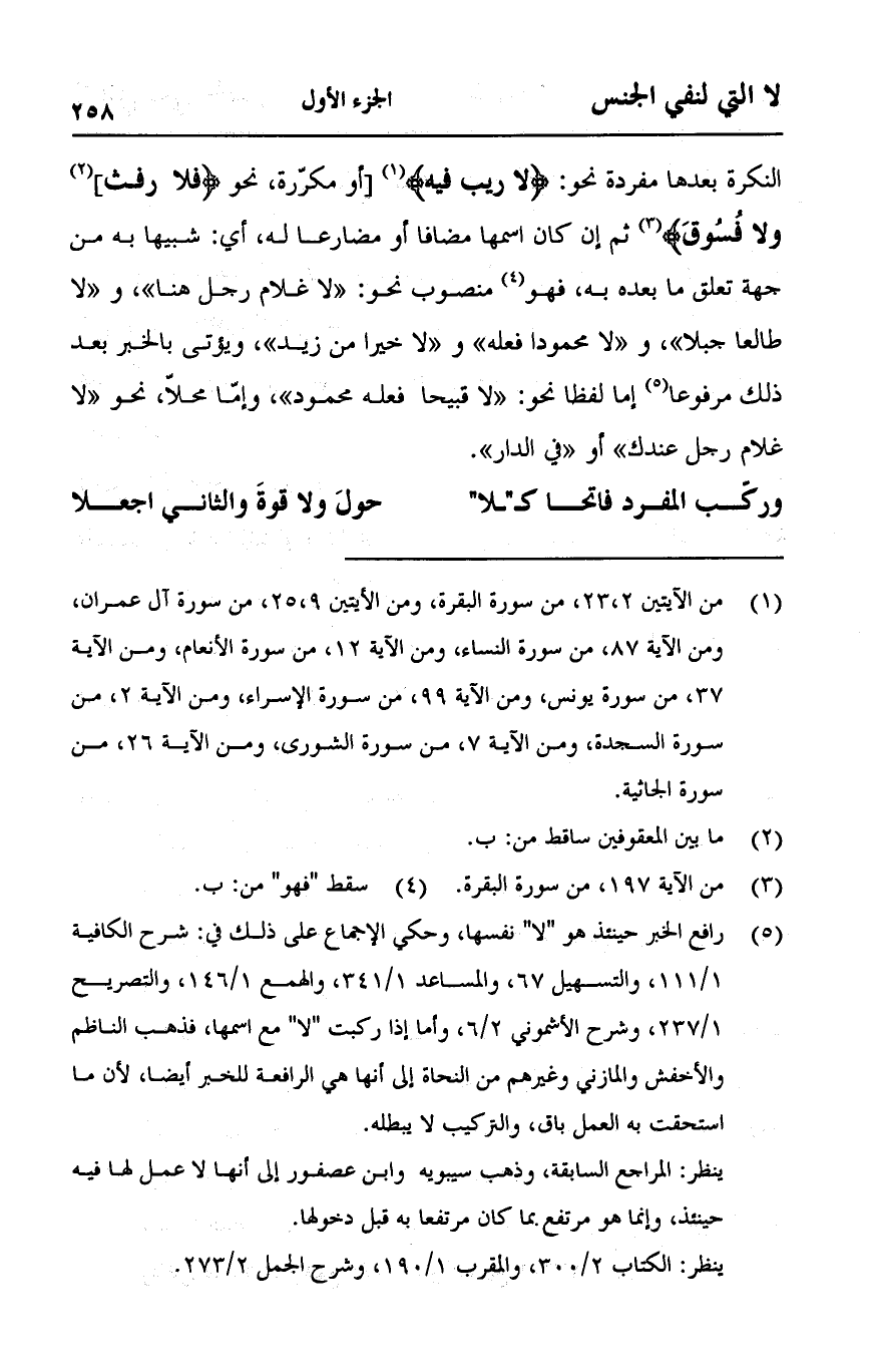 النكرة بعدها مفردة نحو: {لا رَيْبَ فِيهِ} [البقرة:2] [أو مكررة، نحو: {فَلا رَفَثَ وَلا فُسُوقَ} [البقرة:197]] ثم إن كان اسمها مضافا أو مضارعا له، أي: شبيها به من جهة تعلق ما بعده به، فهو منصوب نحو: "لا غلام رجل هنا"، و "لا طالعا جبلا" و "لا محمودا فعله" و "لا خيرا من زيد"، ويؤتى بالخبر بعد ذلك مرفوعا إما لفظا نحو: "لا قبيحا فعله محمود"، وإما محلا، نحو "لا غلام رجل عندك" أو "في الدار".