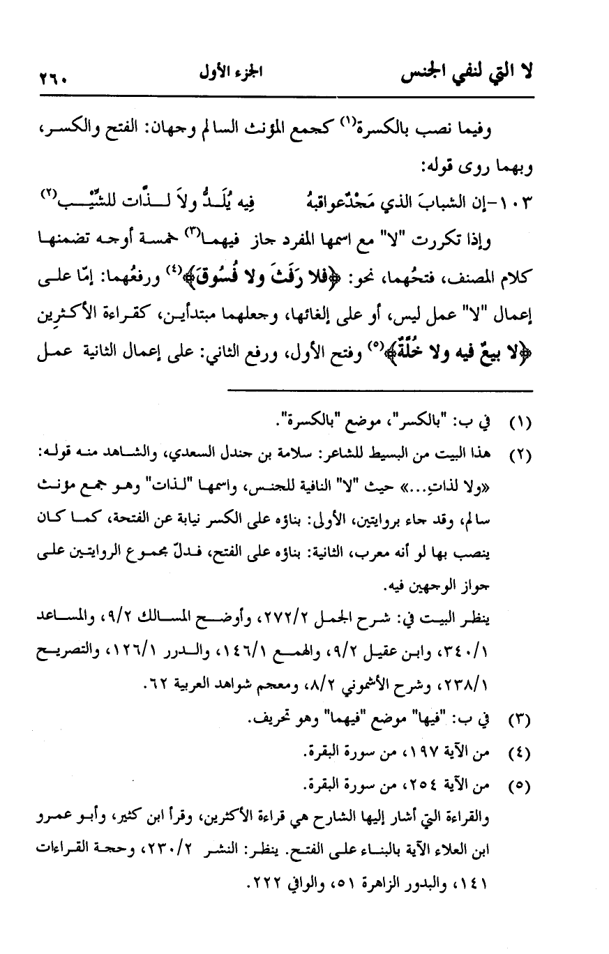 وإذا تكررت "لا" مع اسمها المفرد جاز فيهما خمسة أوجه تضمنها كلام المصنف، فتحهما، نحو: {فَلا رَفَثَ وَلا فُسُوقَ} [البقرة:197] ورفعهما: إما على إعمال "لا" عمل ليس، أو على إلغائها، وجعلهما مبتدأين، كقراءة الأكثرين {لا بَيْعٌ فِيهِ وَلا خُلَّةٌ} [البقرة:254] وفتح الأول، ورفع الثاني: على إعمال الثانية عمل