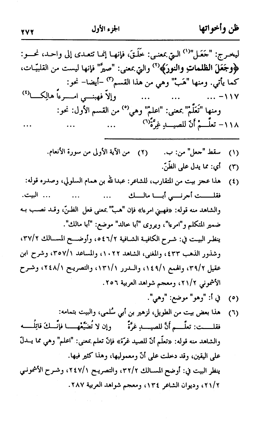 ليخرج: "جعل" التي بمعنى: خلق، إنما تتعدى إلى واحد، نحو: {وَجَعَلَ الظُّلُمَاتِ وَالنُّورَ} [الأنعام:1] والتي بمعنى: "صير" فإنها ليست من القلبيات، كما يأتي. ومنها "هب" وهي من هذا القسم -أيضا- نحو: