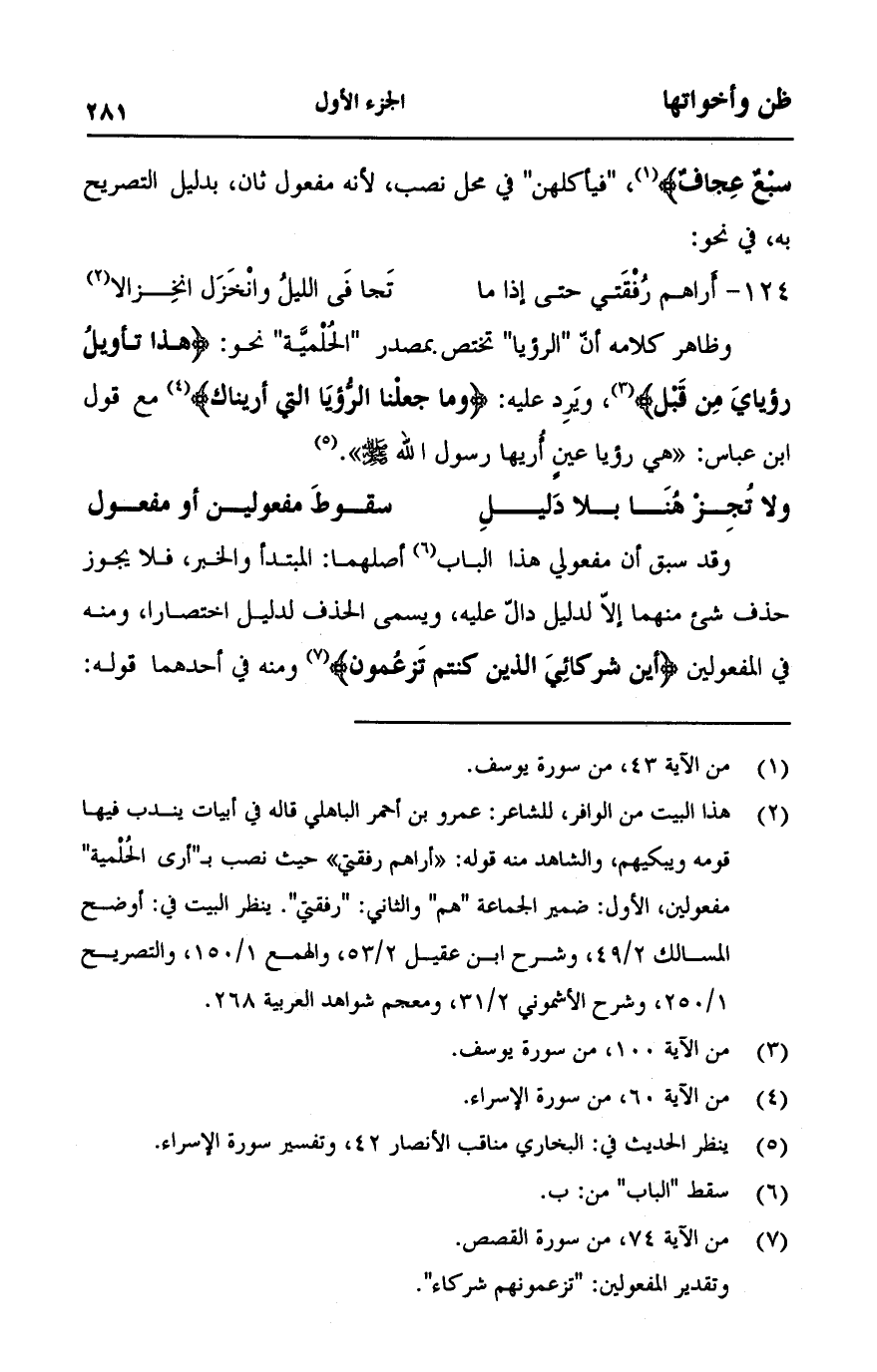 وظاهر كلامه أن "الرؤيا" تختص بمصدر "الحلمية" نحو: {هَذَا تَأْوِيلُ رُؤْيَايَ مِنْ قَبْلُ} [يوسف:100]، ويرد عليه: {وَمَا جَعَلْنَا الرُّؤْيَا الَّتِي أَرَيْنَاكَ} [الإسراء:60] مع قول ابن عباس: "هي رؤيا عين أريها رسول الله صلى الله عليه وسلم".