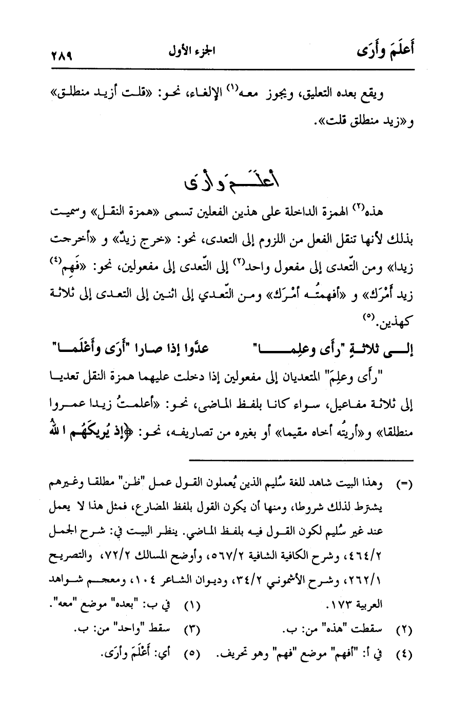 "رأى وعلم" المتعديان إلى مفعولين إذا دخلت عليهما همزة النقل تعديا إلى ثلاثة مفاعيل، سواء كانا بلفظ الماضي، نحو: "أعلمت زيدا عمروا منطلقا" و "أريته أخاه مقيما" أو بغيره من تصاريفه، نحو: {إِذْ يُرِيكَهُمُ اللَّهُ