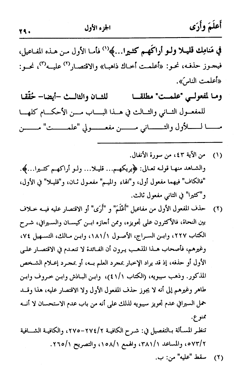 فِي مَنَامِكَ قَلِيلًا وَلَوْ أَرَاكَهُمْ كَثِيرًا ...} [الأنفال:43] فأما الأول من هذه المفاعيل، فيجوز حذفه، نحو: "أعلمت أخاك ذاهبا" والاقتصار عليه، نحو: "أعلمت الناس".