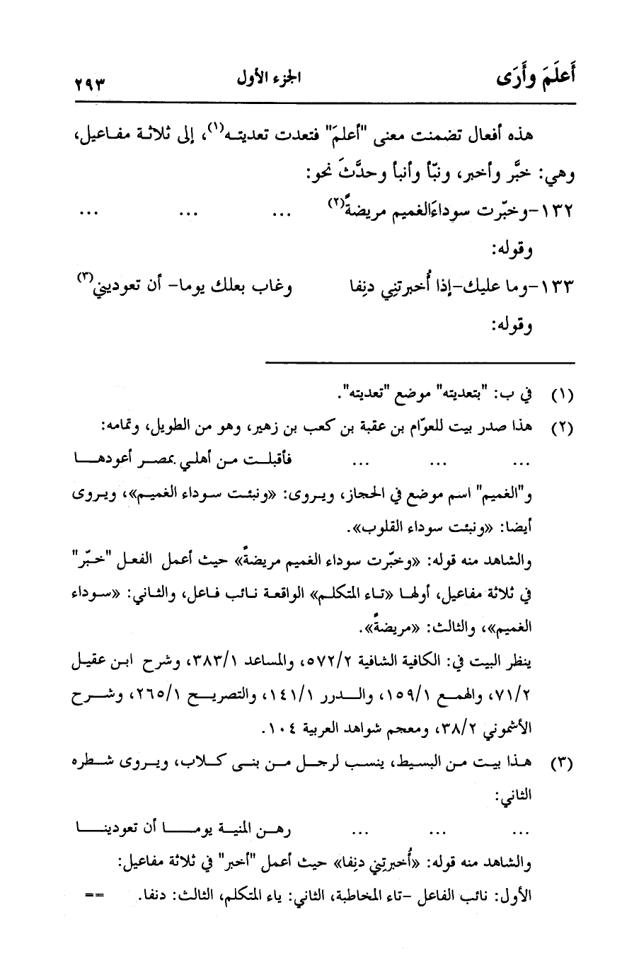 هذه أفعال تضمنت معنى "أعلم" فتعدت تعديته، إلى ثلاثة مفاعيل، وهي: خبر وأخبر، ونبأ وأنبأ وحدث نحو: