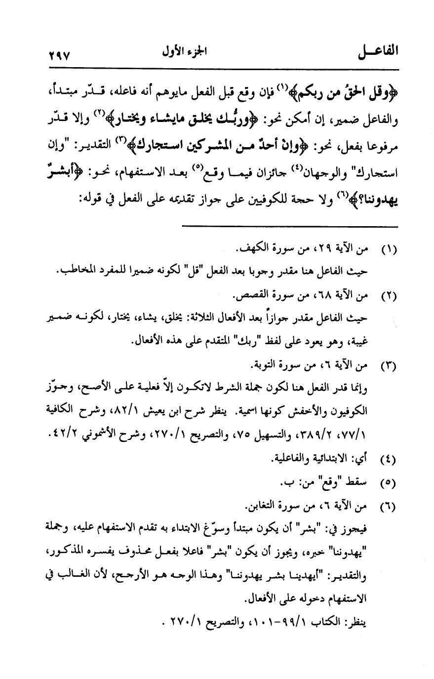 {وَقُلِ الْحَقُّ مِنْ رَبِّكُمْ} [الكهف:29] فإن وقع قبل الفعل ما يوهم أنه فاعله، قدر مبتدأ، والفاعل ضمير، إن أمكن نحو: {وَرَبُّكَ يَخْلُقُ مَا يَشَاءُ وَيَخْتَارُ} [القصص:68] وإلا قدر مرفوعا بفعل، نحو: {وَإِنْ أَحَدٌ مِنَ الْمُشْرِكِينَ اسْتَجَارَكَ} [التوبة:6] التقدير: "وإن استجارك" والوجهان جائزان فيما وقع بعد الاستفهام، نحو: {أَبَشَرٌ يَهْدُونَنَا} [التغابن:6] ولا حجة للكوفيين على جواز تقديمه على الفعل في قوله: