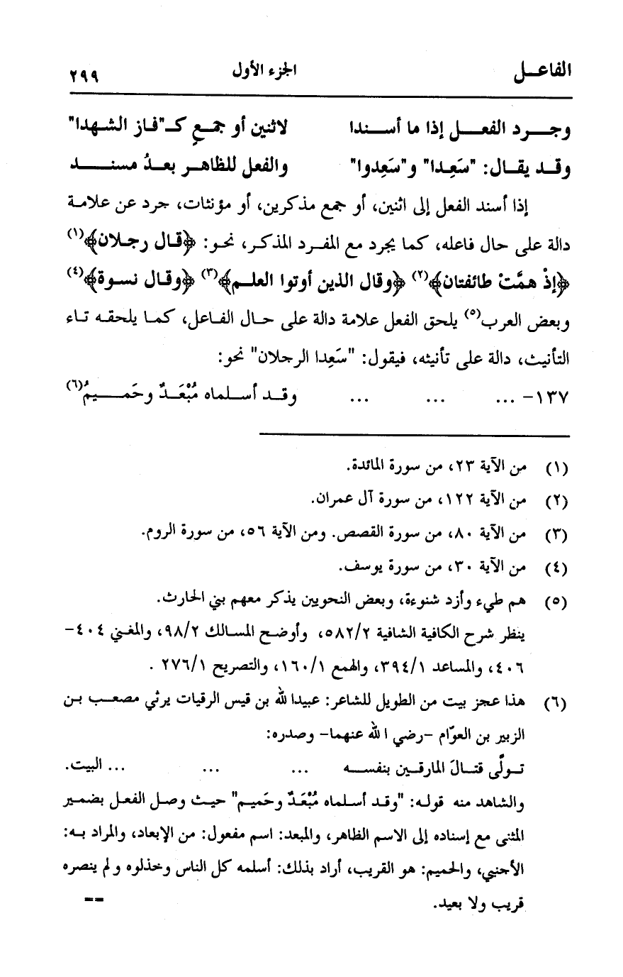 (وجرد الفعل إذا ما أسندا ... لاثنين أو جمعٍ كـ"فاز الشهدا")