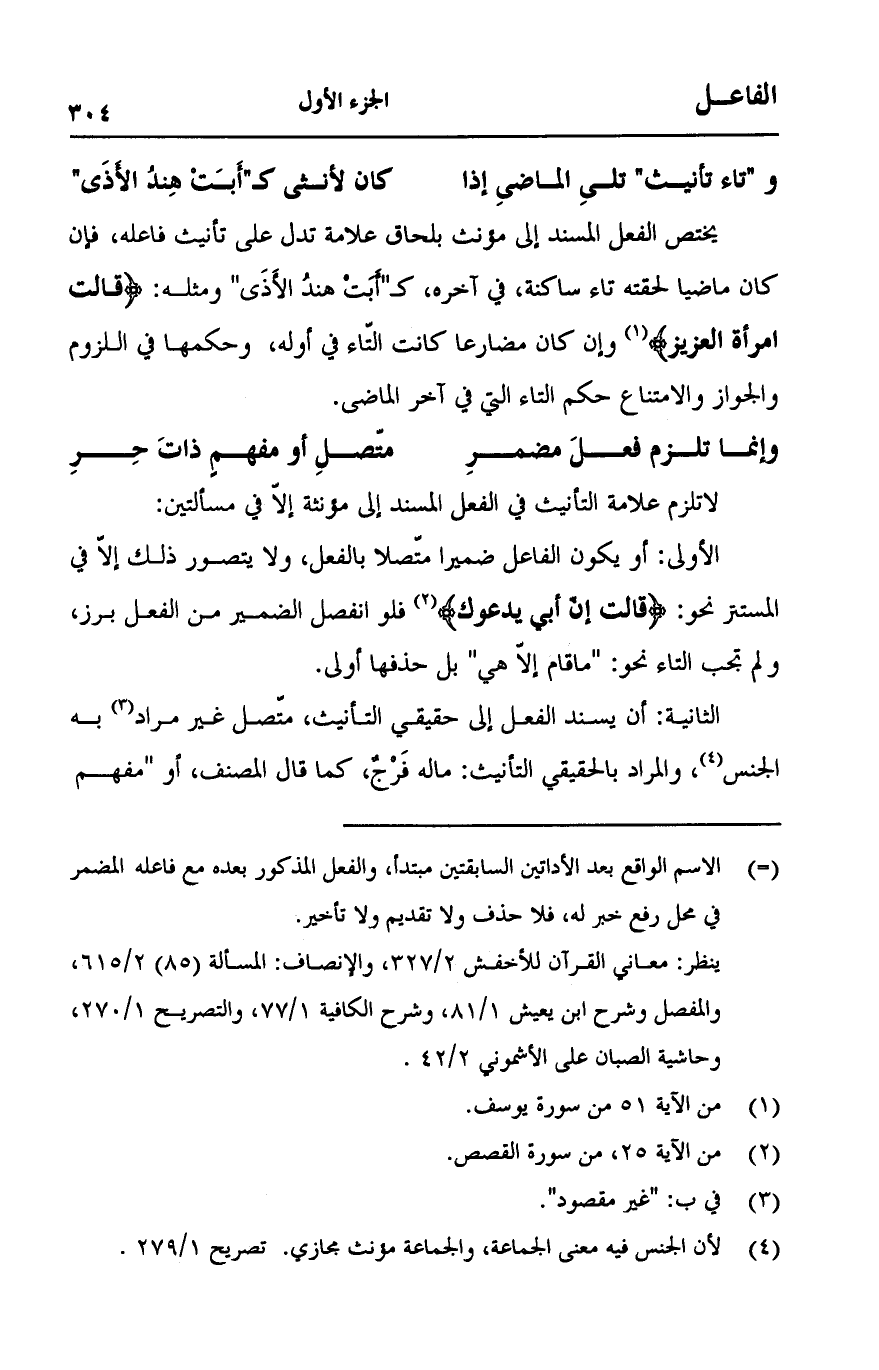يختص الفعل المسند إلى مؤنث بلحاق علامة تدل على تأنيث فاعله، فإن كان ماضيا لحقته تاء ساكنة، في آخره، كـ"أبت هند الأذى" ومثله: {قَالَتِ امْرَأَةُ الْعَزِيزِ} [يوسف:51] وإن كان مضارعا كانت التاء في أوله، وحكمها في اللزوم والجواز والامتناع حكم التاء التي في آخر الماضي.
