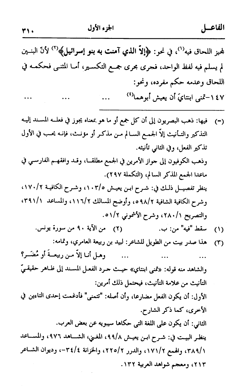 لمجيز اللحاق فيه، في نحو: {إِلَّا الَّذِي آمَنَتْ بِهِ بَنُوا إِسْرَائِيلَ} [يونس:90] لأن البنين لم يسلم فيه لفظ الواحد، فجرى مجرى جمع التكسير، أما المثنى فحكمه في اللحاق وعدمه حكم مفرده، ونحو:
