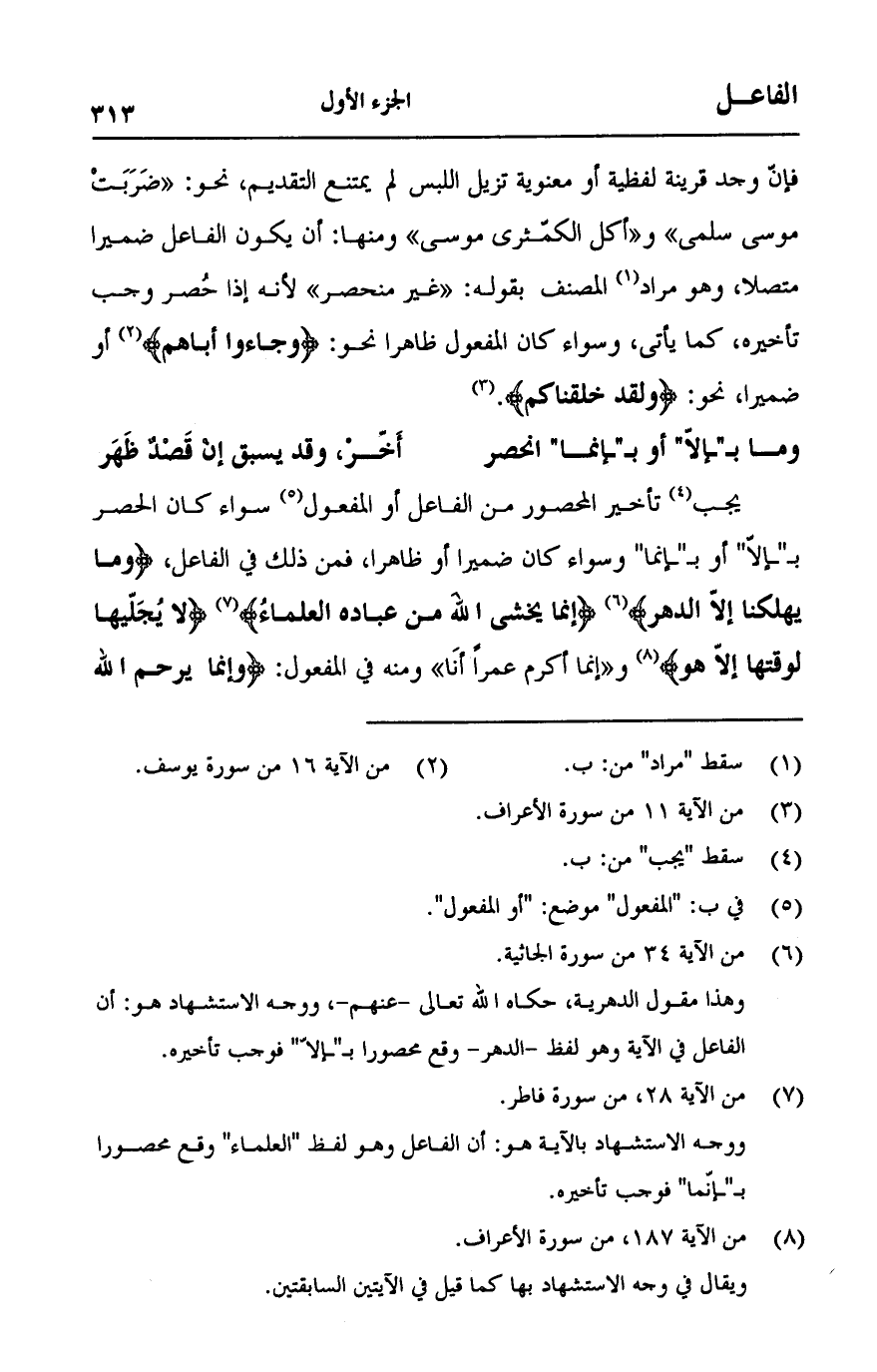 يجب تأخير المحصور من الفاعل أو المفعول سواء كان الحصر بـ"إلا" أو بـ"إنما" وسواء كان ضميرا أو ظاهرا، فمن ذلك في الفاعل، {وَمَا يُهْلِكُنَا إِلَّا الدَّهْرُ} [الجاثية:24] {إِنَّمَا يَخْشَى اللَّهَ مِنْ عِبَادِهِ الْعُلَمَاءُ} [فاطر:28] {لا يُجَلِّيهَا لِوَقْتِهَا إِلَّا هُوَ} [الأعراف:187] و "إنما أكرم عمراً أنا" ومنه في المفعول: (وإنما يرحم الله